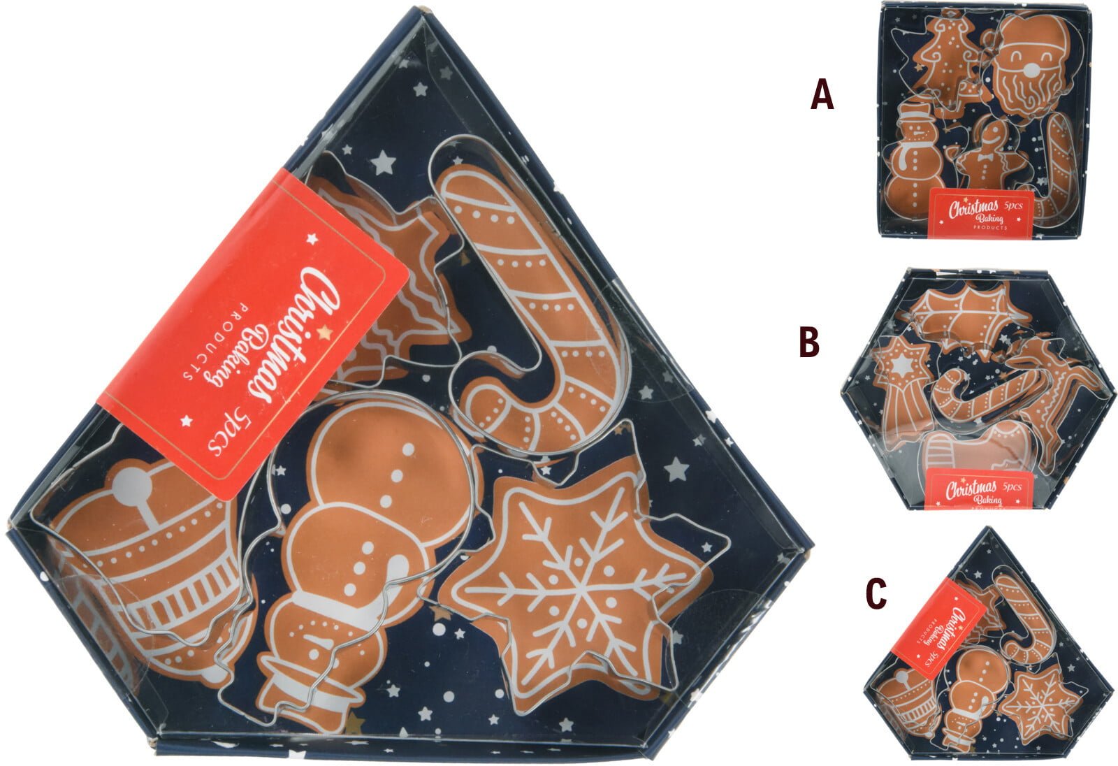 Ausstechform-Set mit Figuren. Das Keksausstecher-Set hat die Form von Rentier, Stock, Weihnachtssocke, Stern und Blatt.