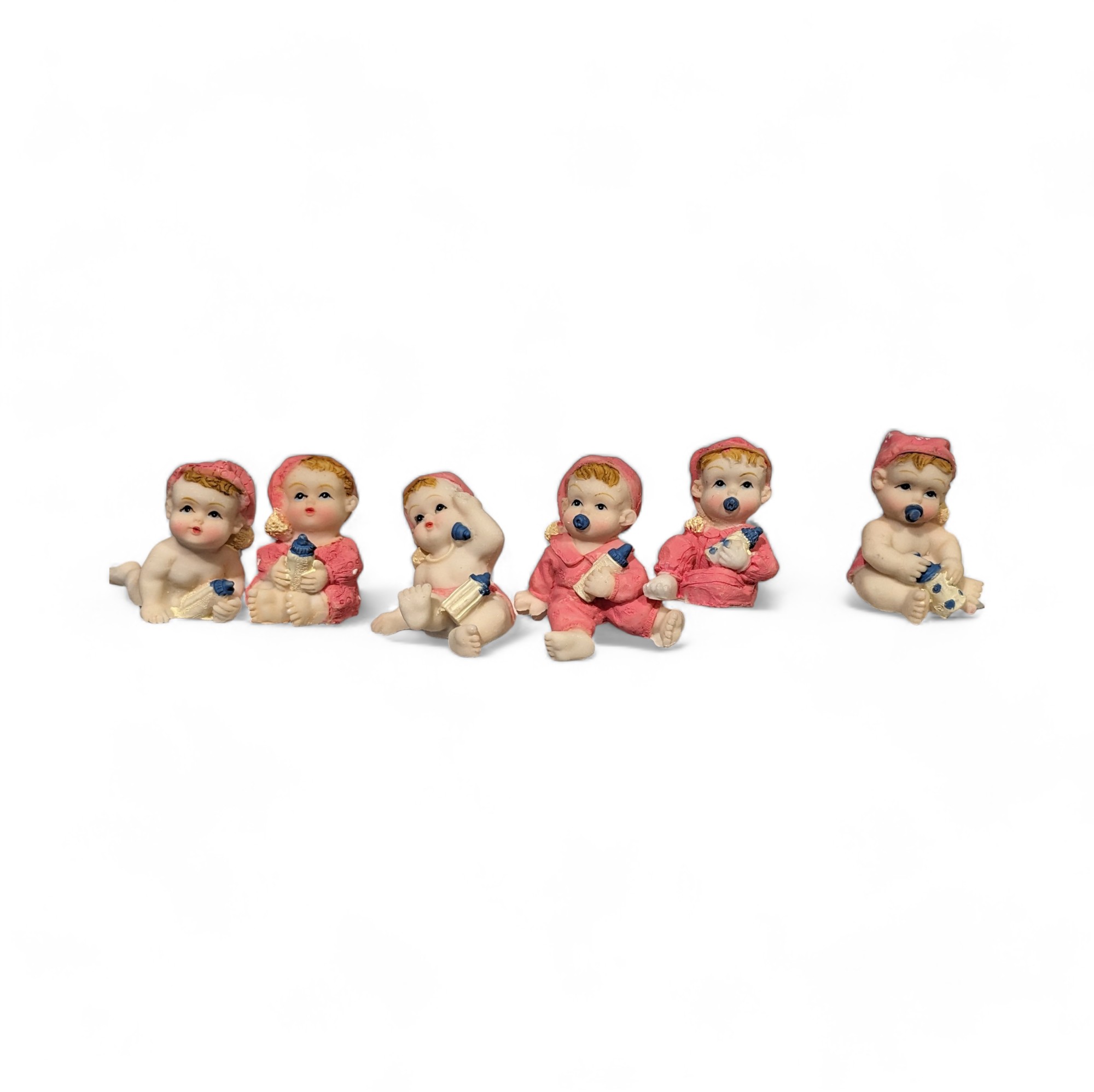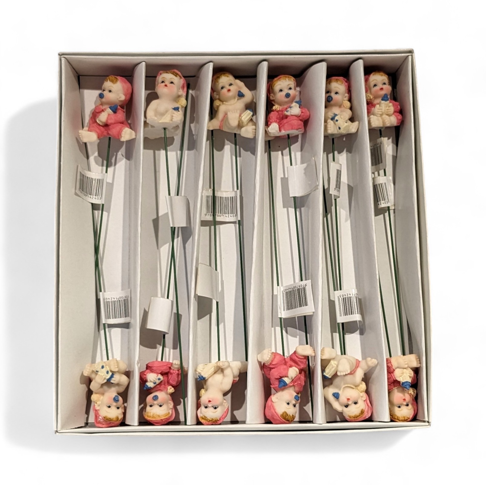 Die Babys sitzen und liegen in verschiedenen Positionen und sind in süße rosa Kleidung gekleidet. Der Stab ist ein 19 cm langer grüner Draht, der gebogen werden kann. Die Babyfiguren können in Sträuße, Dekorationen gesteckt werden, können aber auch gekürzt werden, sodass die Figuren als Tischdekoration verwendet werden können.
