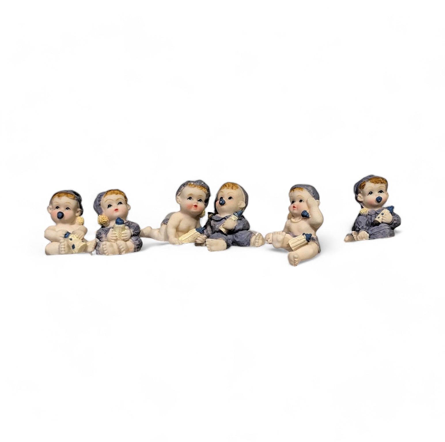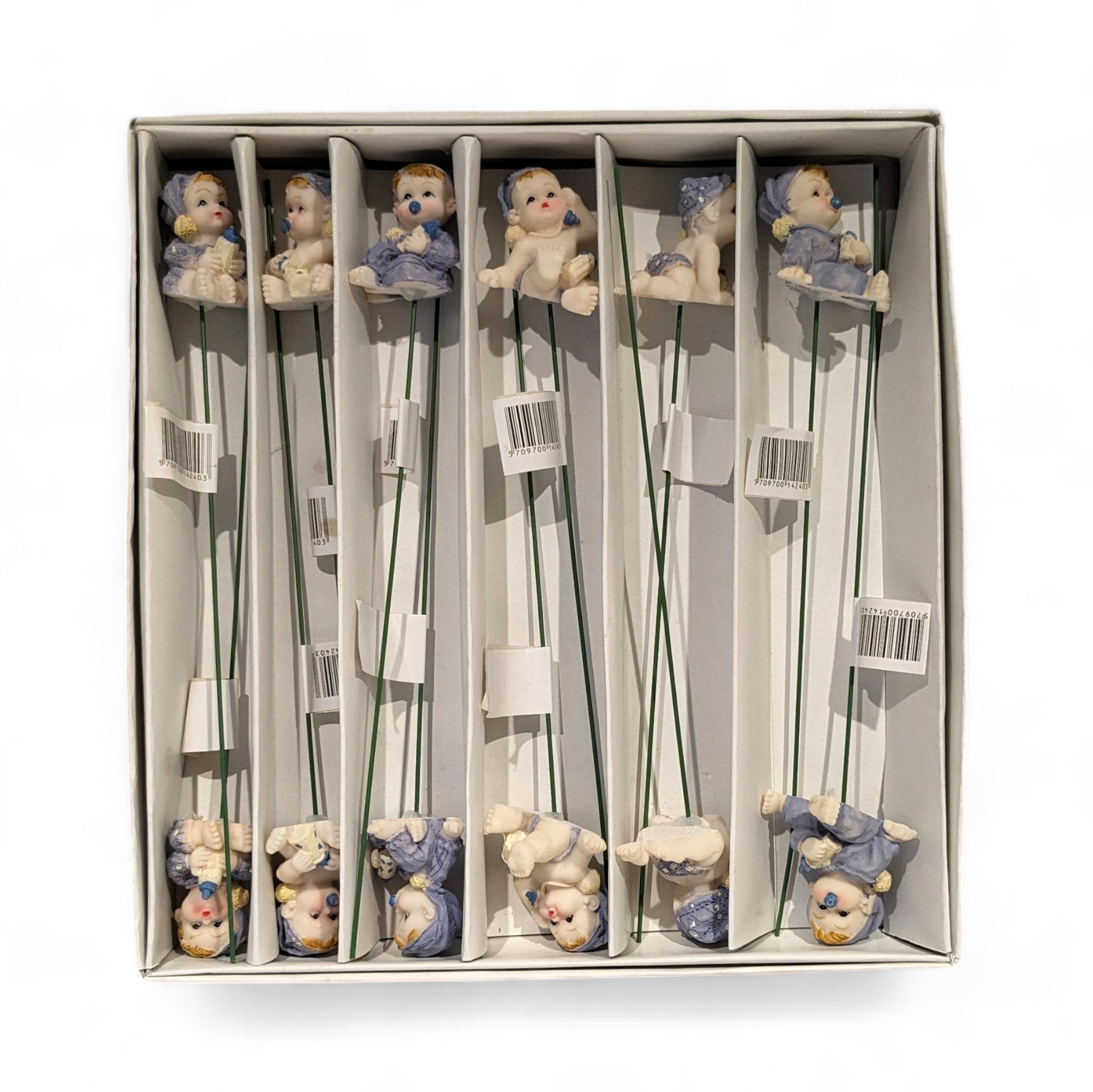 Die Babys sitzen und liegen in verschiedenen Positionen und sind in süße blaue Kleidung gekleidet. Der Stab ist ein 19 cm langer grüner Draht, der gebogen werden kann. Die Babyfiguren können in Sträuße, Dekorationen gesteckt werden, können aber auch gekürzt werden, sodass die Figuren als Tischdekoration verwendet werden können.