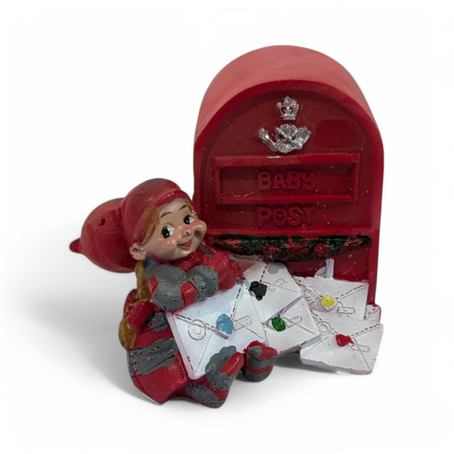 Babynissefigur, sitzendes Mädchen bei rotem Briefkasten für Babypost. Misst 7,5 x 7,5 cm. Babynisser sind aus Polystone gefertigt. Babynisser sind eine der beliebten Weihnachtsfiguren von Susanna Hartmann. Babynisser sind ein beliebtes Sammlerobjekt und hier auf alttiljul.dk verkaufen wir wirklich viele Modelle.