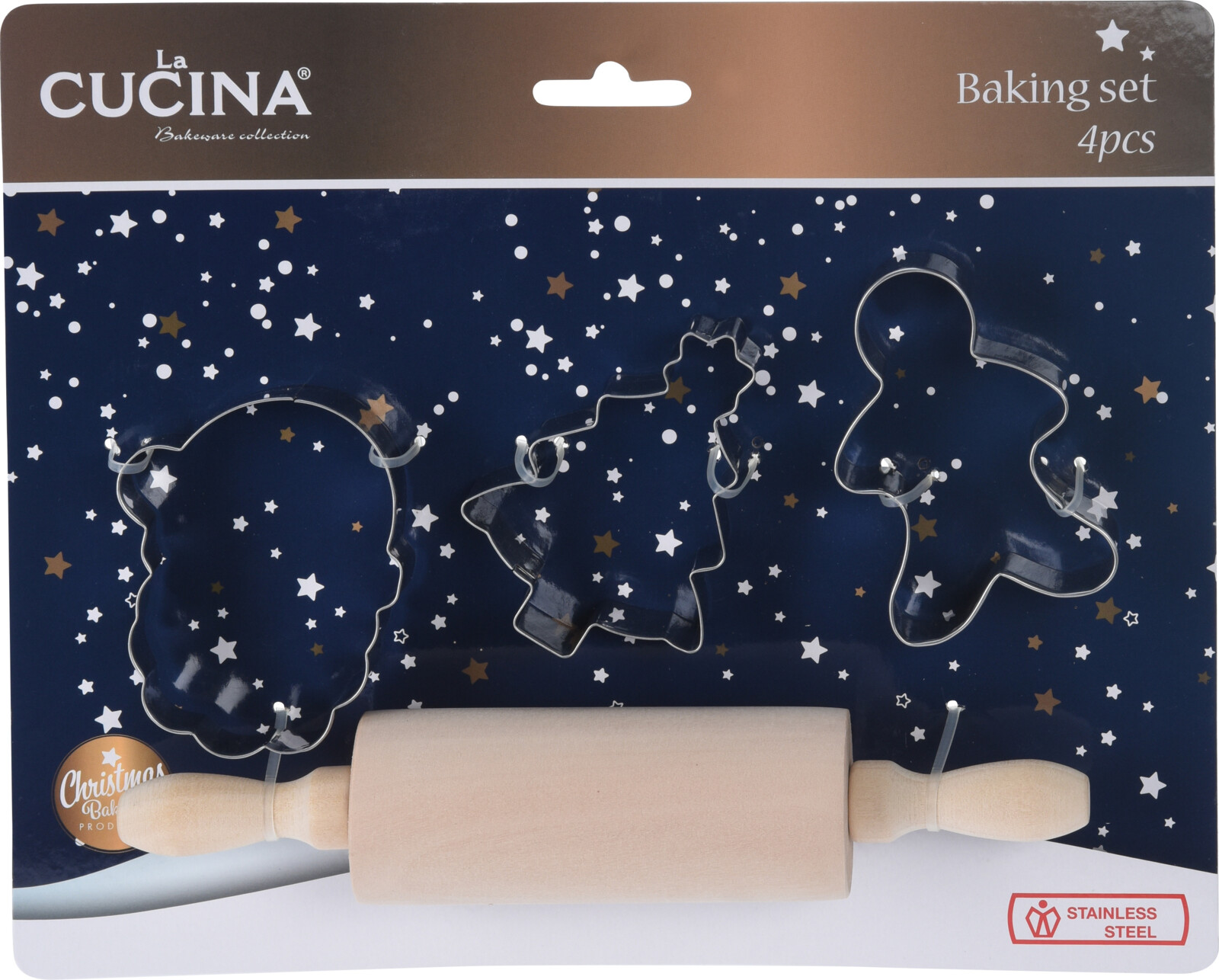 Backset mit Teigrolle aus Holz und 3 Formen aus Stahl. Das Backset ist für Kinder und eignet sich gut für Weihnachtsbacken. Die Teigrolle misst 20 cm von Griff zu Griff. Die Rolle ist 10 cm und der Durchmesser 3,5 cm. Die 3 Metallformen ähneln einem Weihnachtsbaum, einem Lebkuchenmann und einem Weihnachtsmann mit einer Länge von ca. 7,5 cm. Das Set macht es lustig und einfach, mit Kindern zu backen. Kann auch für Salzteig verwendet werden. Gute KALENDERGESCHENKIDEE für Kinder.