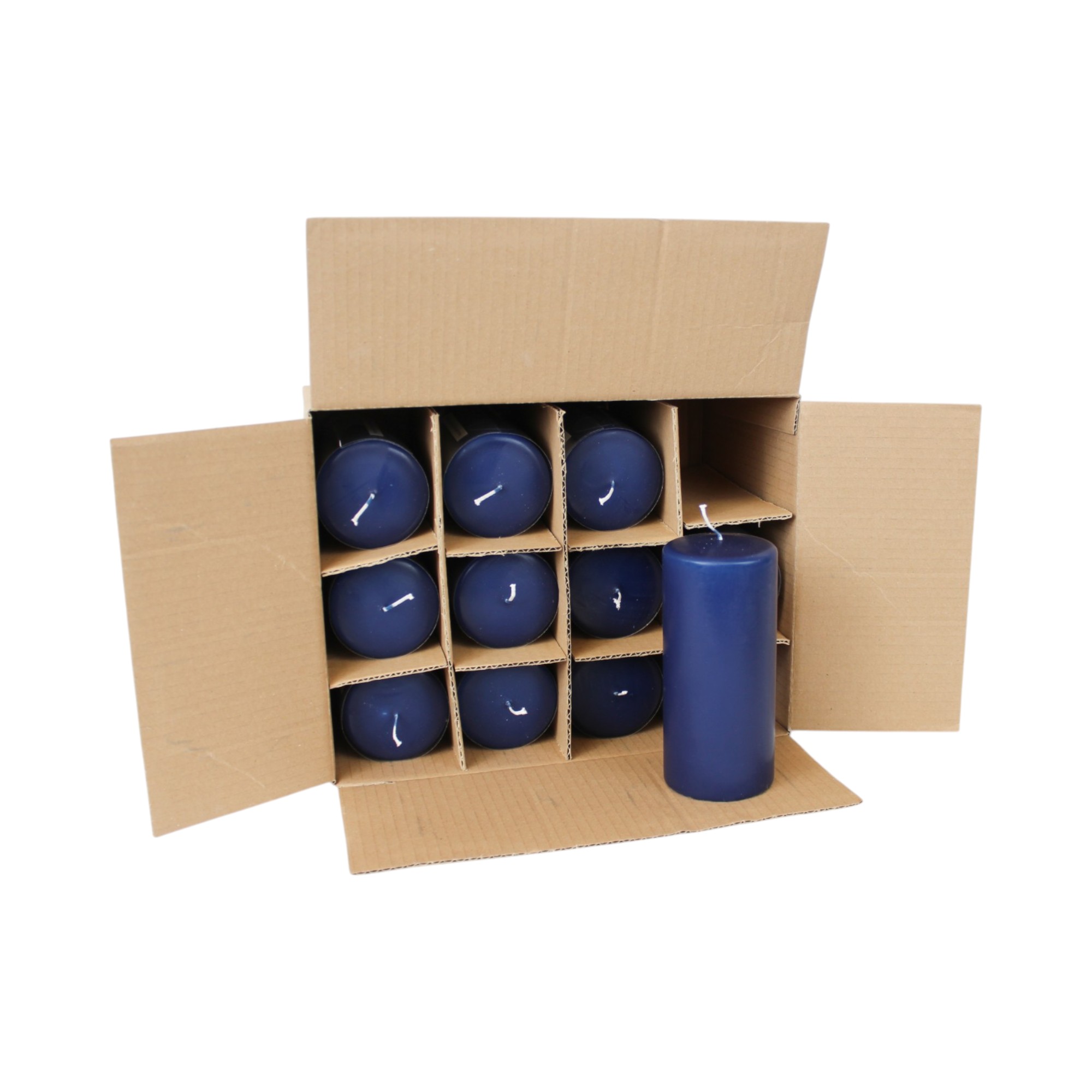 Dunkelblaue glatte Blockkerzen als Kassettenangebot à 12 (stk.). Geeignet für Dekorationen und Feste.