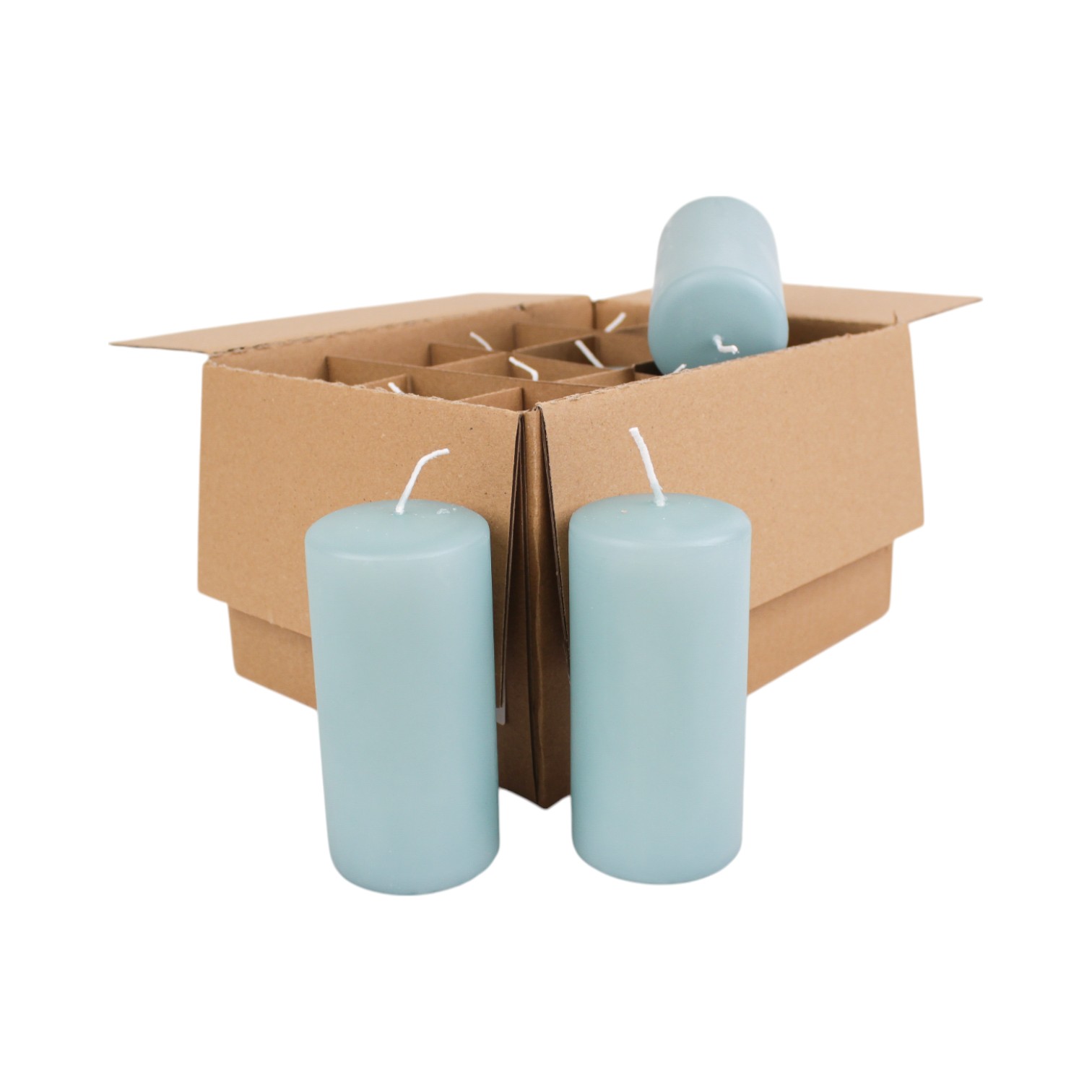 Kiste mit 12 Stk. Blockkerzen in schöner grau-grün Mistel Farbe. Diese sind sehr schöne und elegante Stearinkerzen, die perfekt für Alltag und Fest passen. Kaufen Sie eine ganze Kiste mit 12 Stk. und sparen Sie Geld.