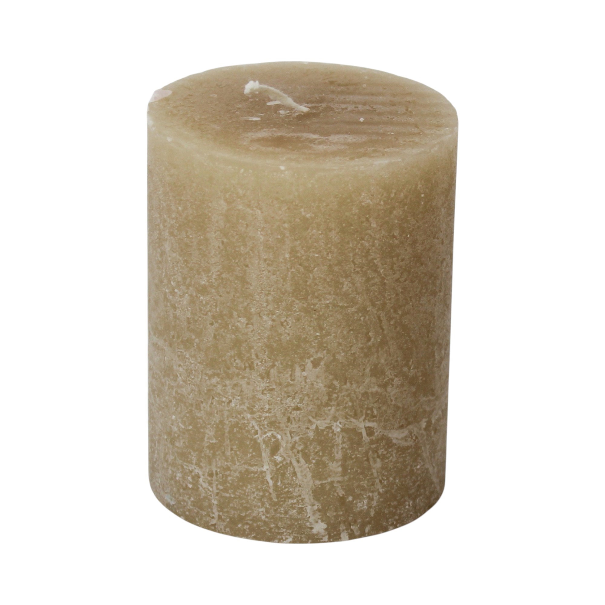 Sandfarbene rustikale durchgefärbte Blockkerze mit flacher Spitze.