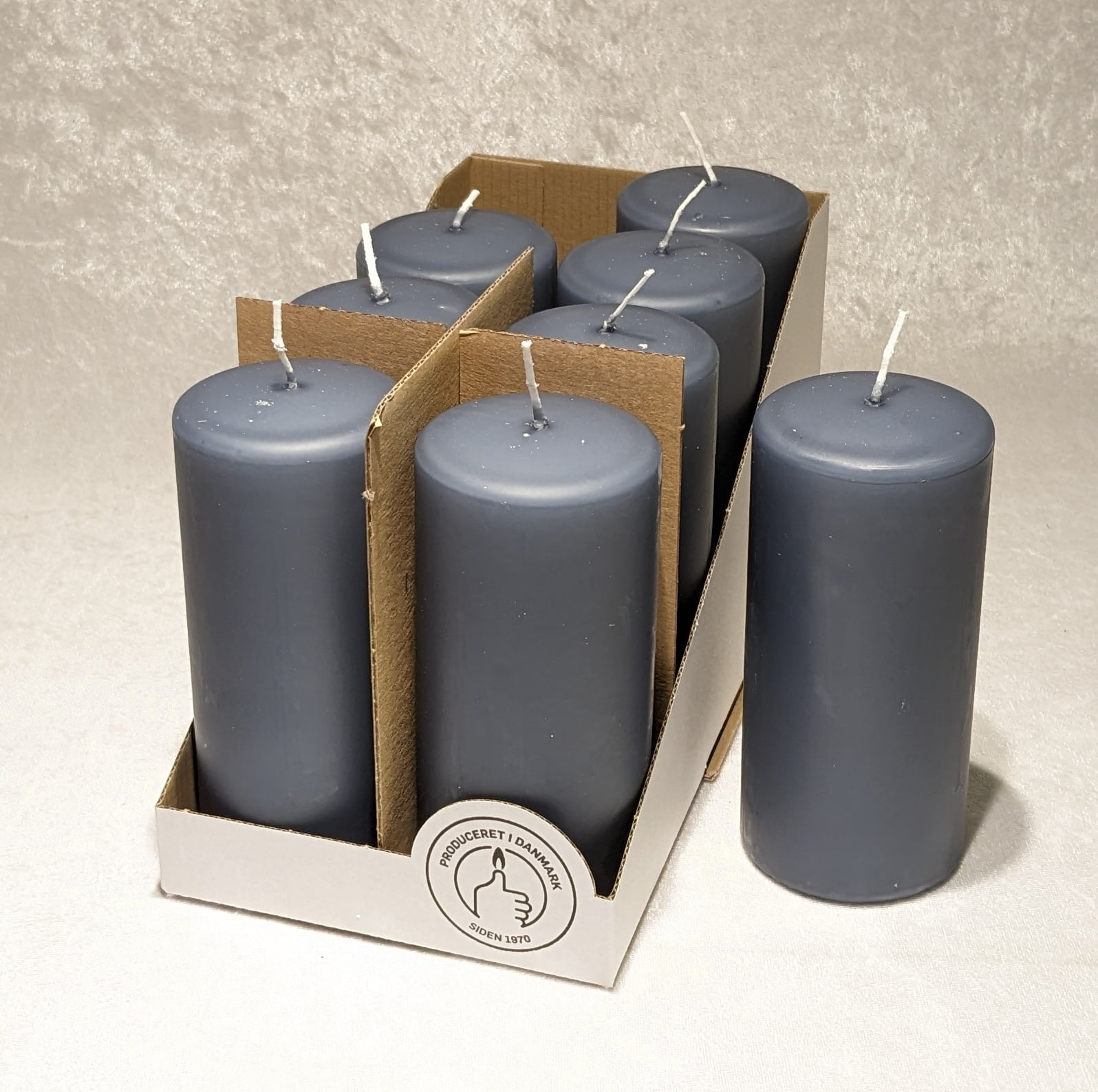 Diese staubblaue Farbe von Blockkerzen ist sehr beliebt für Dekorationen. Sie können diese Kerze hier sowohl als Einzelkerze als auch als Kassettenangebot kaufen.
