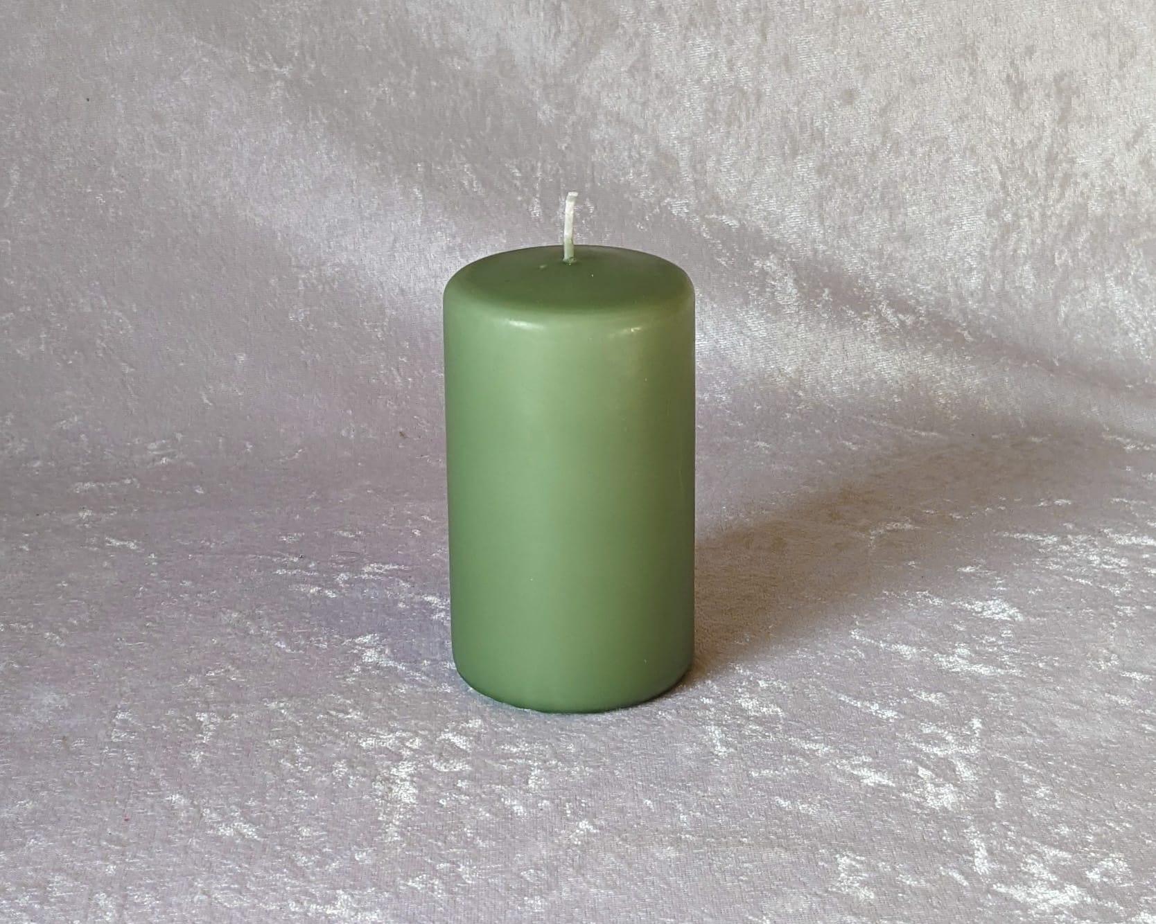 Schönes staubgrünes Blockkerze mit glatter Oberfläche. Die perfekte Kerze für den Festtisch, Advent und Weihnachten.