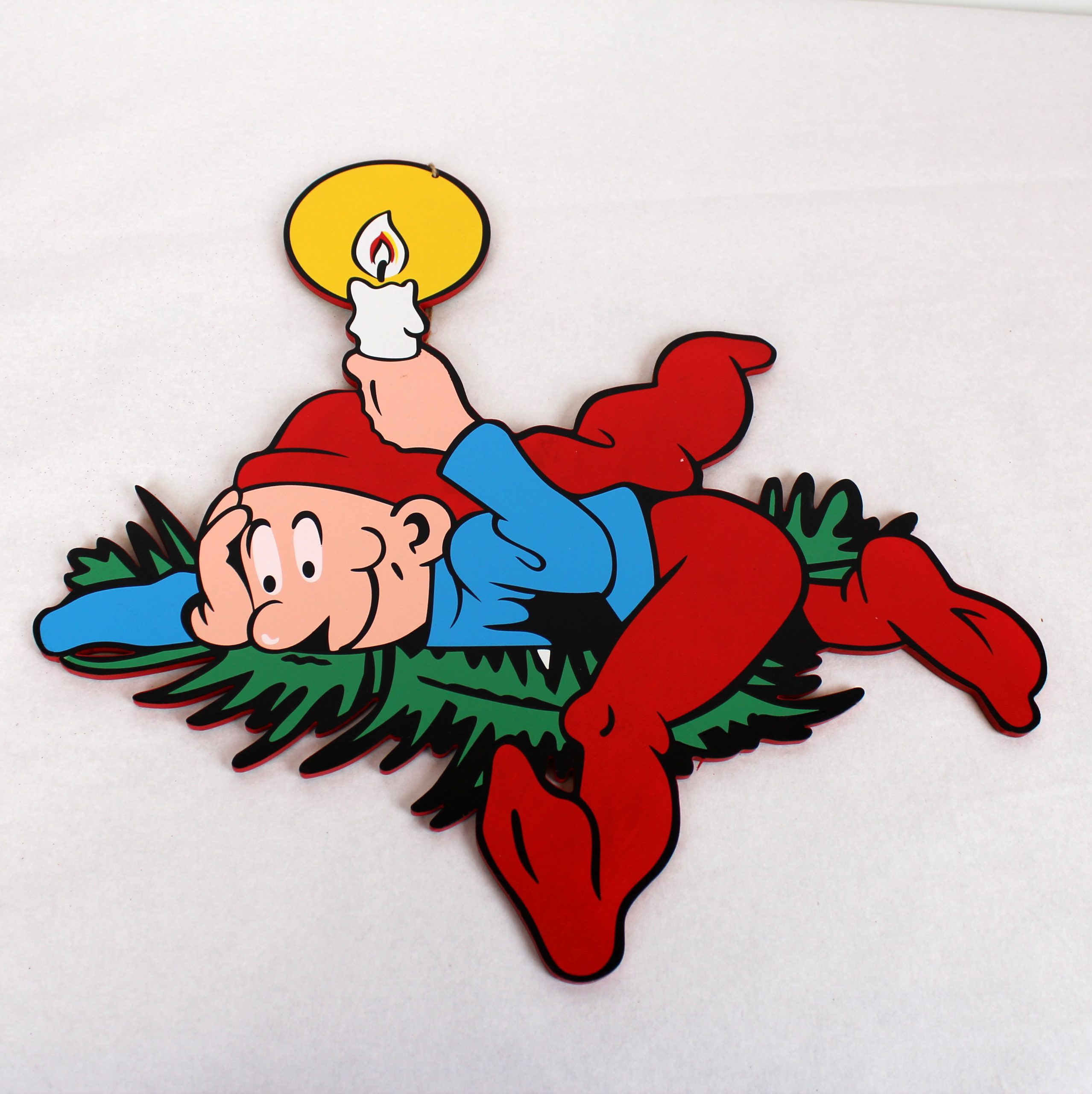 Bramming Wichtel, der eine Weihnachtskerze in der Hand hält. Aus Holz zum Aufhängen. Misst 40 cm.