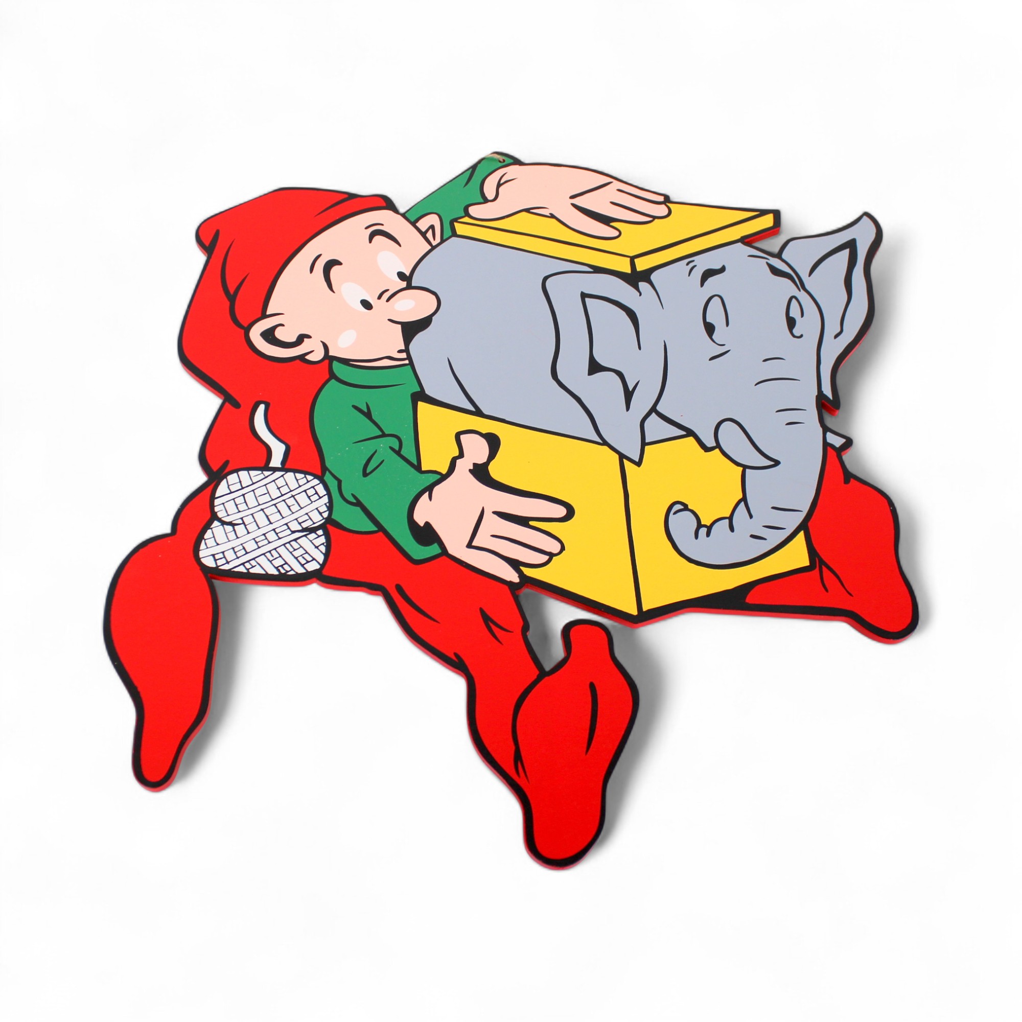 Bramming Wichtel, der einen Elefanten als Geschenk einpackt. Aus Holz zum Aufhängen. Misst ca. 40 cm. Bramming Wichtel sind immer voller Spaß und Unfug, wie dieser, der versucht, einen Elefanten in eine Schachtel zu stecken. Der schöne Wichtel ist auf beiden Seiten bemalt. Diese Holzfigur ist Modell C auf dem Foto. Die Bramming Wichtel wurden von Frederik Bramming entworfen.