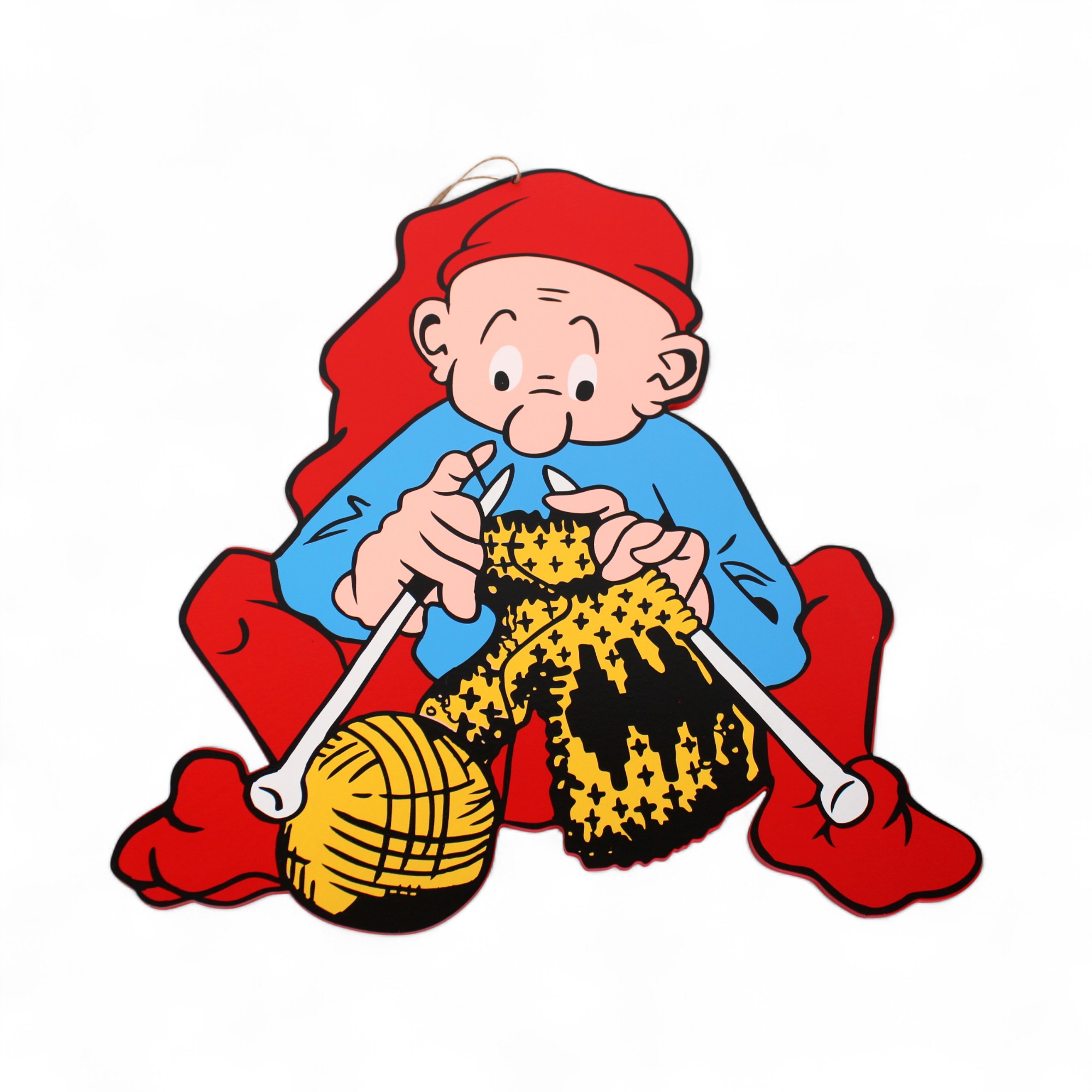 Bramming Wichtel, der einen gelben Pullover strickt. Aus Holz zum Aufhängen. Misst bis zu 40 cm. Bramming Wichtel sind immer voller Spaß und Unfug, wie dieser konzentrierte Kerl im blauen Pullover, der Maschen zählt. Die schönen Wichtel sind auf beiden Seiten bemalt.