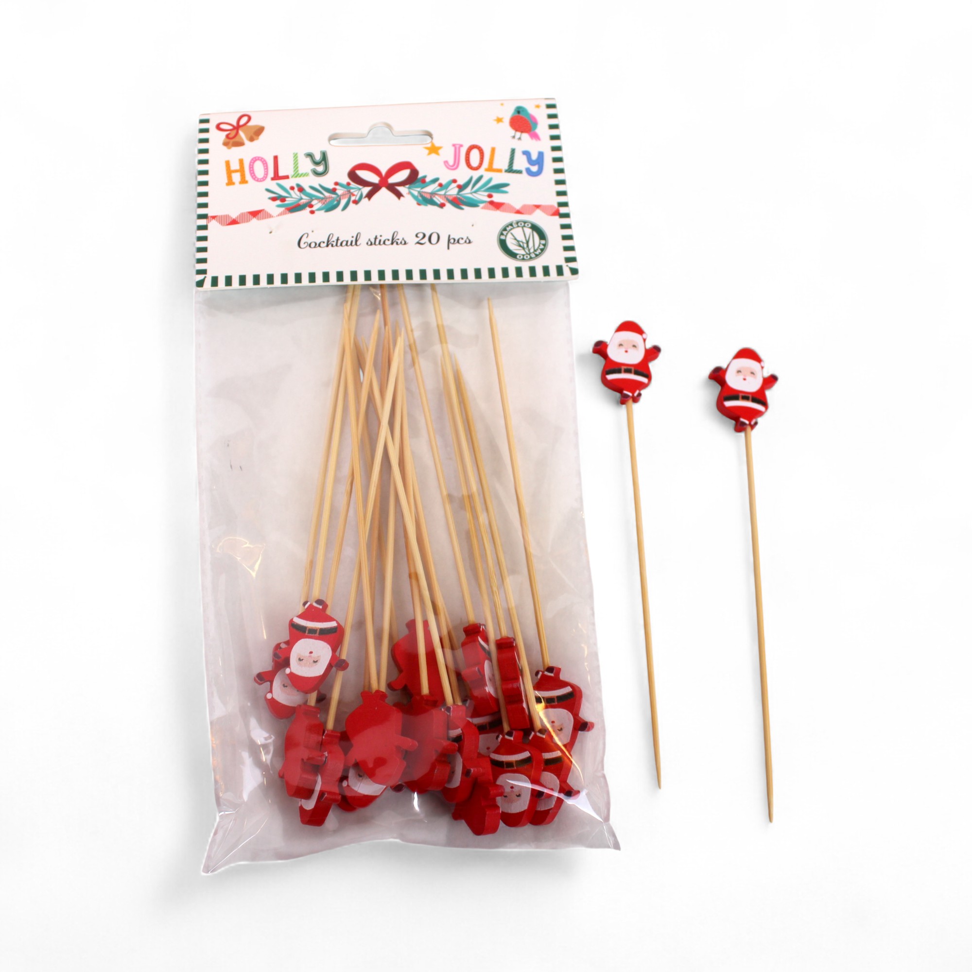Holly Jolly Cocktailstäbchen mit Weihnachtsmann – Wichtel. Produkt: Cocktailstäbchen aus Holz mit Weihnachtsschmuck. Anzahl: 20 stk. pro Packung. 13,5 cm lang. Verwenden Sie sie als festliche Dekoration in Getränken oder Fingerfood.