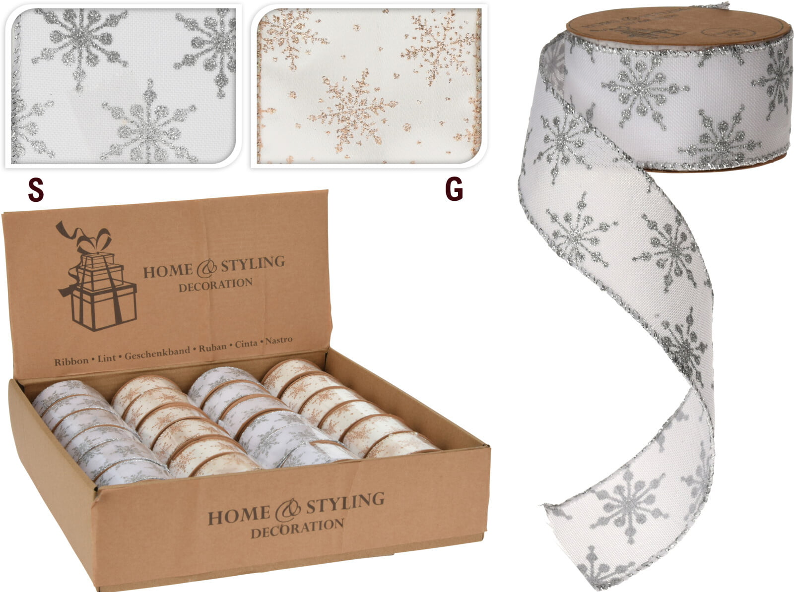 Dekorationsband mit Draht, Gold mit Schneeflocken, 38 mm.