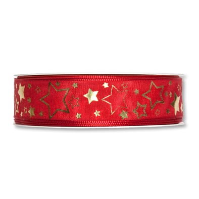 Dekorationsband mit Draht ROT/GOLD Sterne. 25 mm x 25 m.