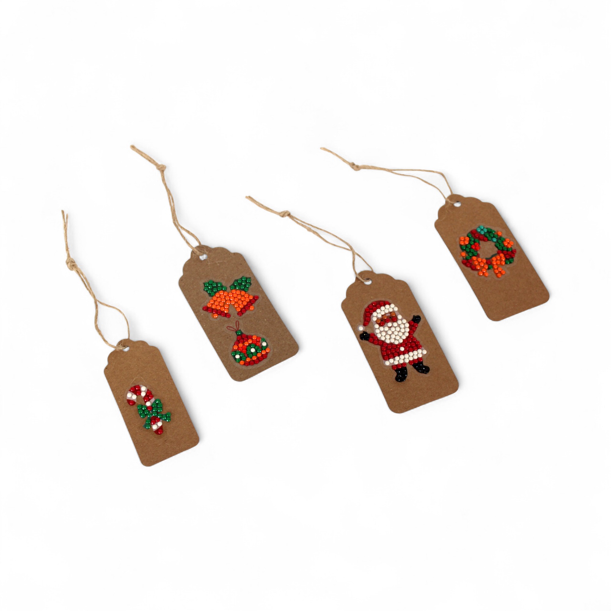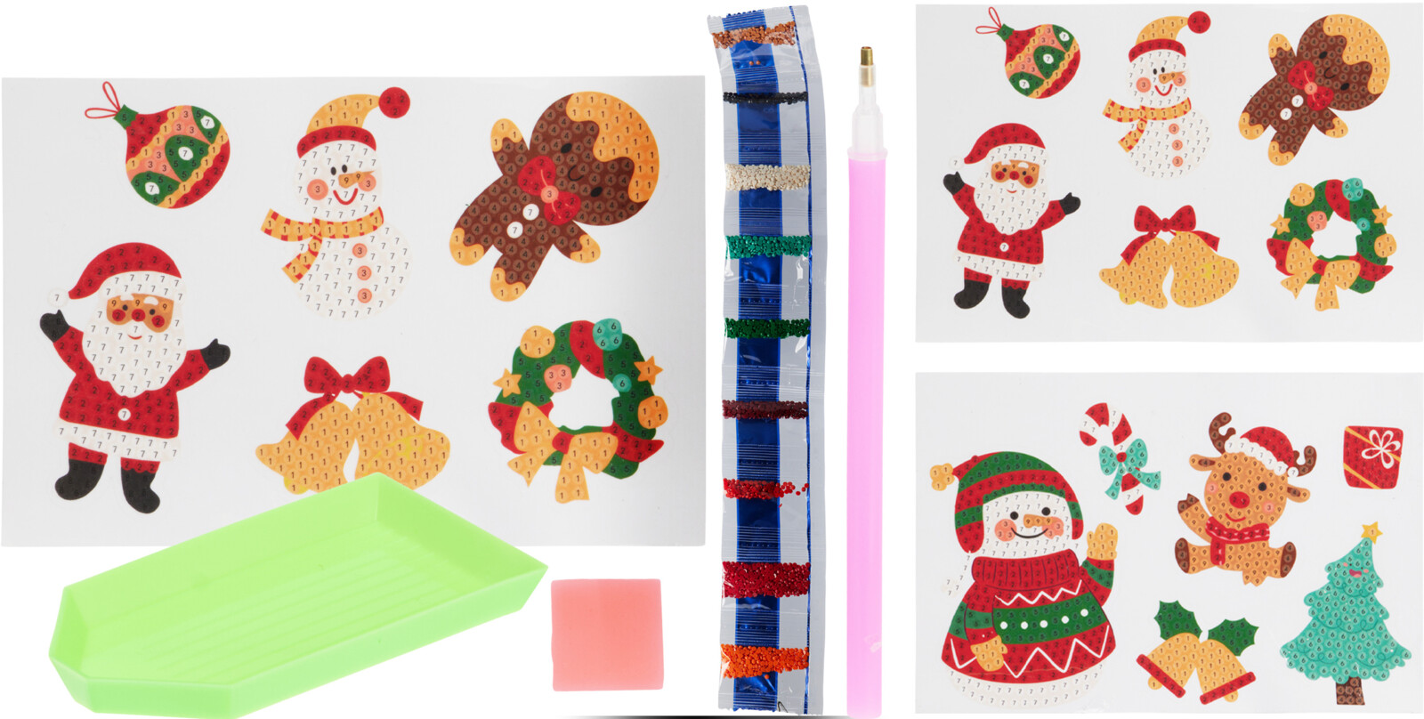 Diamant-Hobbysatz mit 12 Stickern und 9 Farbbeuteln mit Diamanten. Diamond Art Painting. Dieser Hobbysatz enthält kleine Weihnachtsbilder mit kleinen Symbolen (Zahlen), auf die kleine Steine (Diamanten) in der richtigen Farbe mit einem speziellen Stift gesetzt werden. Stift und Schale für Diamanten sowie Anleitung sind enthalten. Die Diamanten werden in kleinen Beuteln in 9 verschiedenen Farben geliefert. Viele Stunden Unterhaltung für Kinder und Erwachsene. Die kleinen Bilder eignen sich perfekt zum Aufkleben auf selbstgemachte Anhänger und Karten. Die Rückseite der 12 Sticker ist selbstklebend.