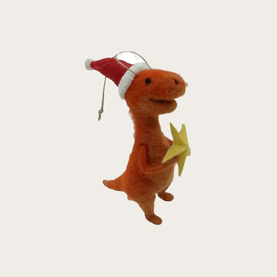 Dinosaurier, ein T-Rex. Weiche Figur aus Wolle und Polyester zum Aufhängen. Die Figur hat eine rote Wichtelmütze und hält einen gelben Stern und eine braune Schnur zum Aufhängen. Der Dino misst 7 x 15 x 12 cm und ist braun. Der Dinosaurier wird als Kalendergeschenk für kleine Kinder Freude bereiten.