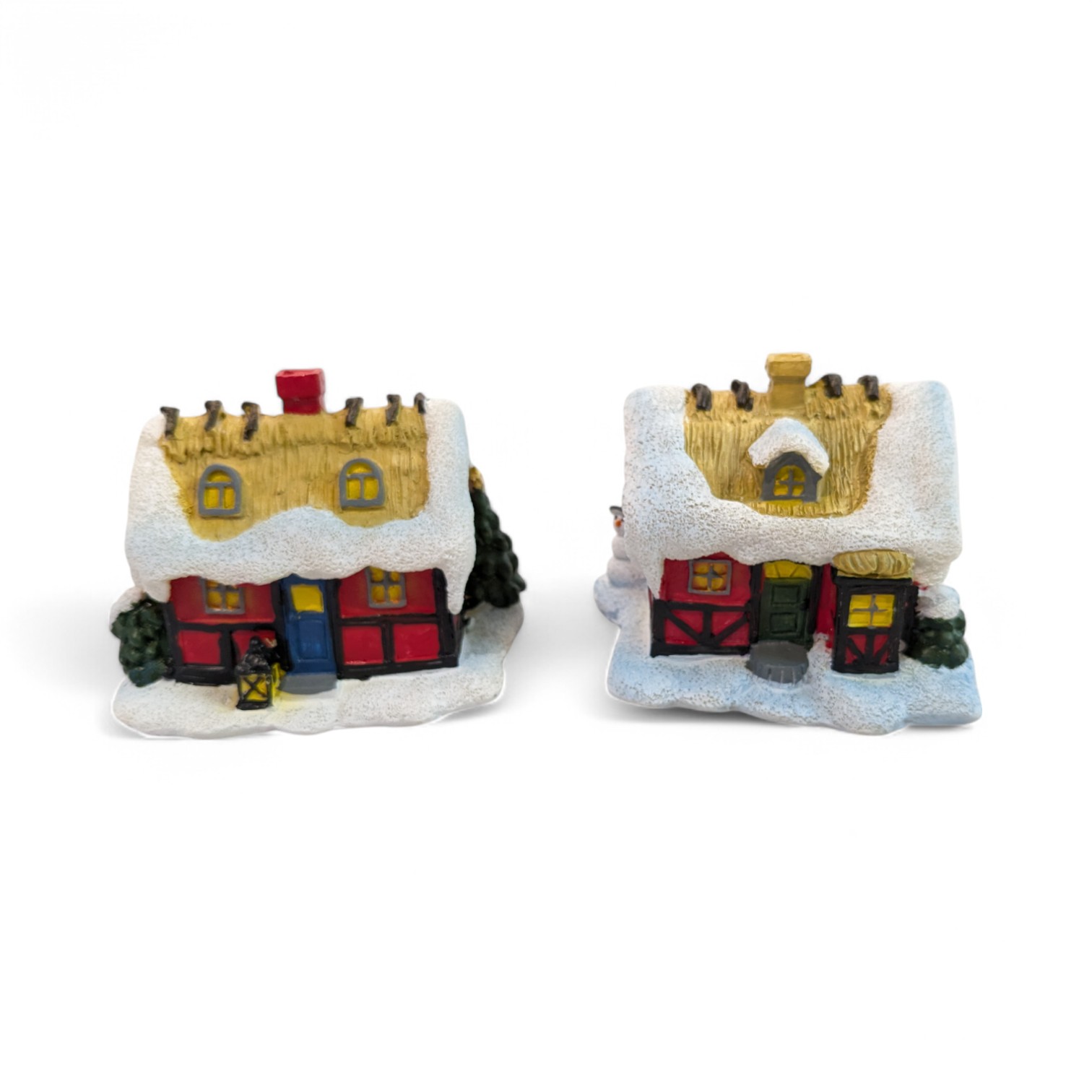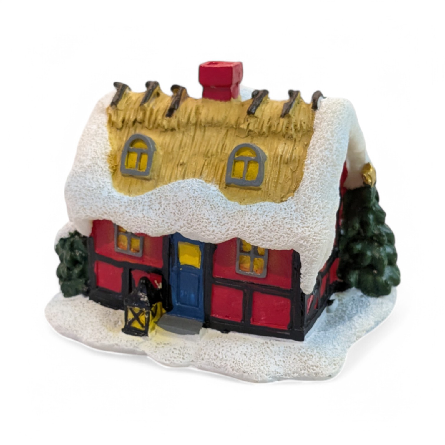 Weihnachtshaus mit Fachwerk und Strohdach mit Schnee und Schneemann. Das Haus ist rot mit grünem Tür und Erker. Gemütliche Stimmung mit Licht in den Fenstern. Misst 8 x 10 cm. Höhe 7 cm. Material: Polystone. Das Haus passt perfekt in eine gemütliche Weihnachts- und Wichtellandschaft.