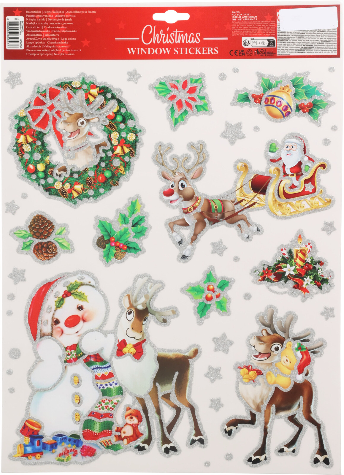 Fensteraufkleber, Weihnachts-Vinylaufkleber mit Rentieren und Weihnachtsschmuck. Das Blatt misst 42 x 30 cm und hat 4-5 große Weihnachtsaufkleber und mehrere kleine. Exklusive X-mas-Glitterfiguren, alle mit einem schönen glitzernden Silberrand. Wir haben viele verschiedene Vinylaufkleber für Fenster in der Kategorie https://alttiljul.dk/produkt-kategori/diverse-julevarer/julefigurer/vinylfigurer-windowsstickers/.