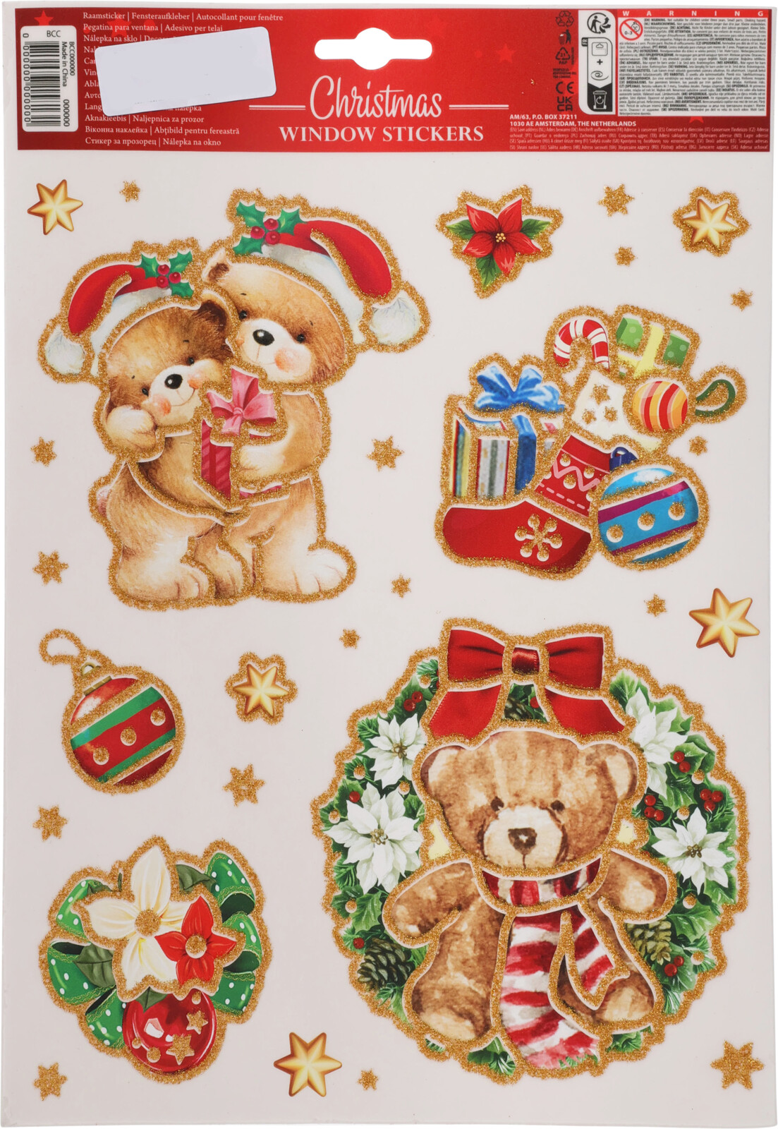 Fensteraufkleber, Weihnachts-Vinylaufkleber mit Teddybären und Weihnachtsschmuck. Das Blatt misst 21 x 30 cm und hat 4 große Weihnachtsaufkleber und mehrere kleine. Exklusive X-mas-Glitterfiguren, alle mit einem schönen Glitzergoldrand. Wir haben viele verschiedene Vinylaufkleber für Fenster in der Kategorie https://alttiljul.dk/produkt-kategori/diverse-julevarer/julefigurer/vinylfigurer-windowsstickers/.