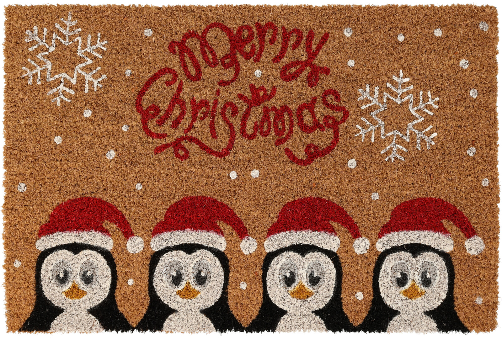 Türmatte aus Kokos mit Weihnachtsmotiv von vier Pinguinen. Schöne Türmatte mit dem Text „Merry Christmas“ und vier Pinguinen heißen willkommen. Größe: 39 x 59 x 1,5 cm. Material: Kokosfasern, die haltbar sind. Heißen Sie willkommen in Ihrem Eingangsbereich oder vor Ihrer Tür mit einer schönen Weihnachtsmatte. Kokosmatten können sowohl draußen als auch drinnen verwendet werden.