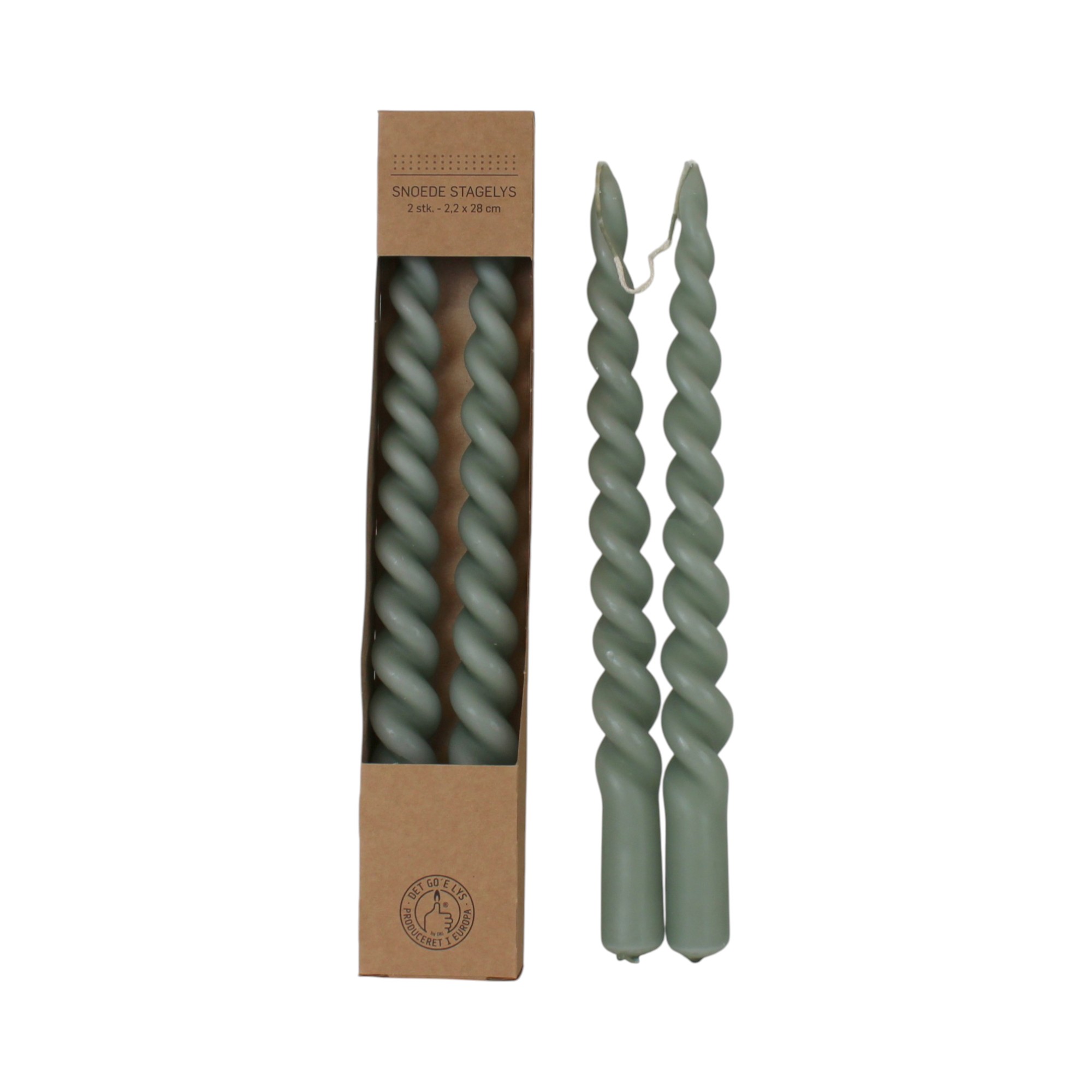 Gedrehte Stabkerze STAUBGRÜN Stearinlys 28 cm. (pk. à 2 stk.)