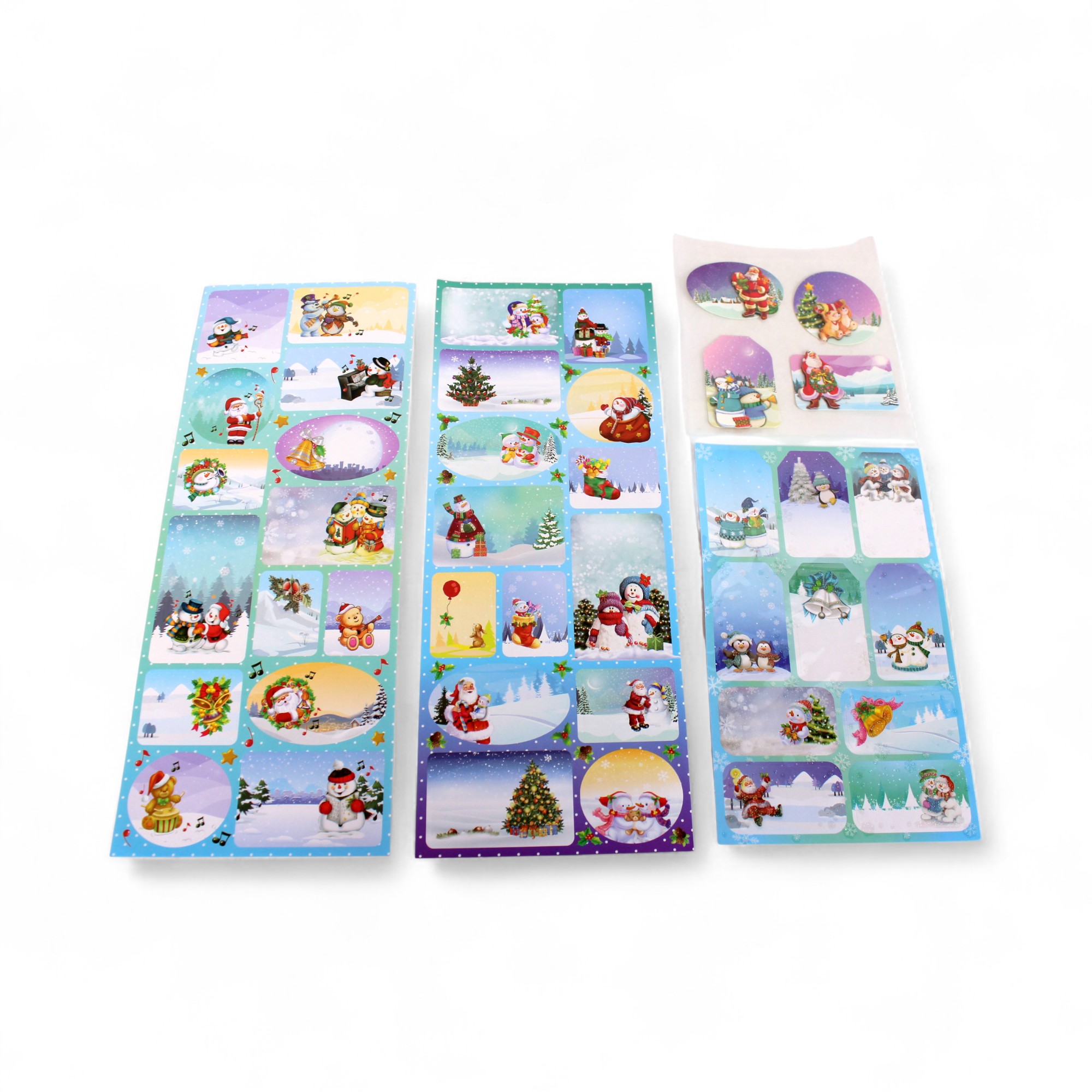 Selbstklebende Zu- und Von-Etiketten für Weihnachten in drei Beuteln, insgesamt 30 stk. auf blauem Hintergrund. 4 stk. Pop-up-Etiketten in Beutel 1. 12 stk. mit Glitzer dekorierte Etiketten in Beutel 2. 14 stk. verschiedene große und kleine Etiketten in Beutel 3. Geschenketikettenbogen mit 30 schönen Weihnachtsmarken, die direkt aufgeschrieben und auf die Weihnachtsgeschenke geklebt werden können. Die Geschenketiketten haben Weihnachtsmotive mit beliebten Weihnachtsfiguren und Dekorationen und sind in verschiedenen Formen.