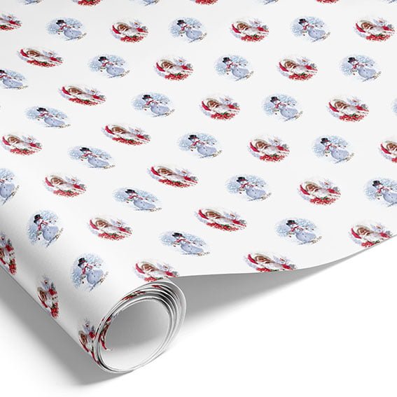 Geschenkpapier 5 Meter x 70 cm. Weißer Druck mit Weihnachtsmann und Schneemann