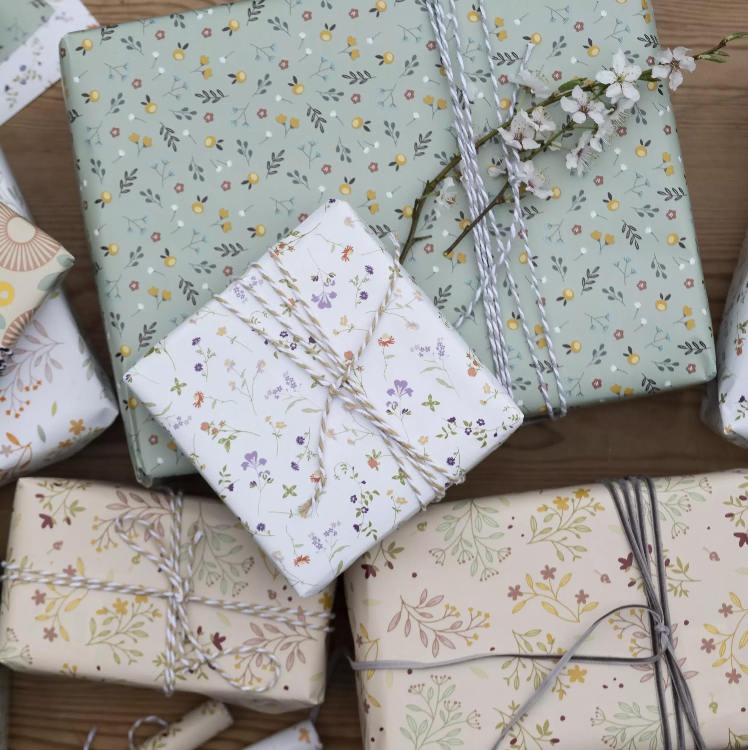 Geschenkpapier mit beigem Hintergrund und Blumen. Das Geschenkpapier misst 70 cm und es sind 5 m auf der Rolle. LWC-beschichtetes Geschenkpapier in hochwertiger Qualität und FCS-zertifiziert. Das Geschenkpapier besteht aus Recyclingpapier (70%) ohne Füllmaterial in der Rolle und ist umweltfreundlich.