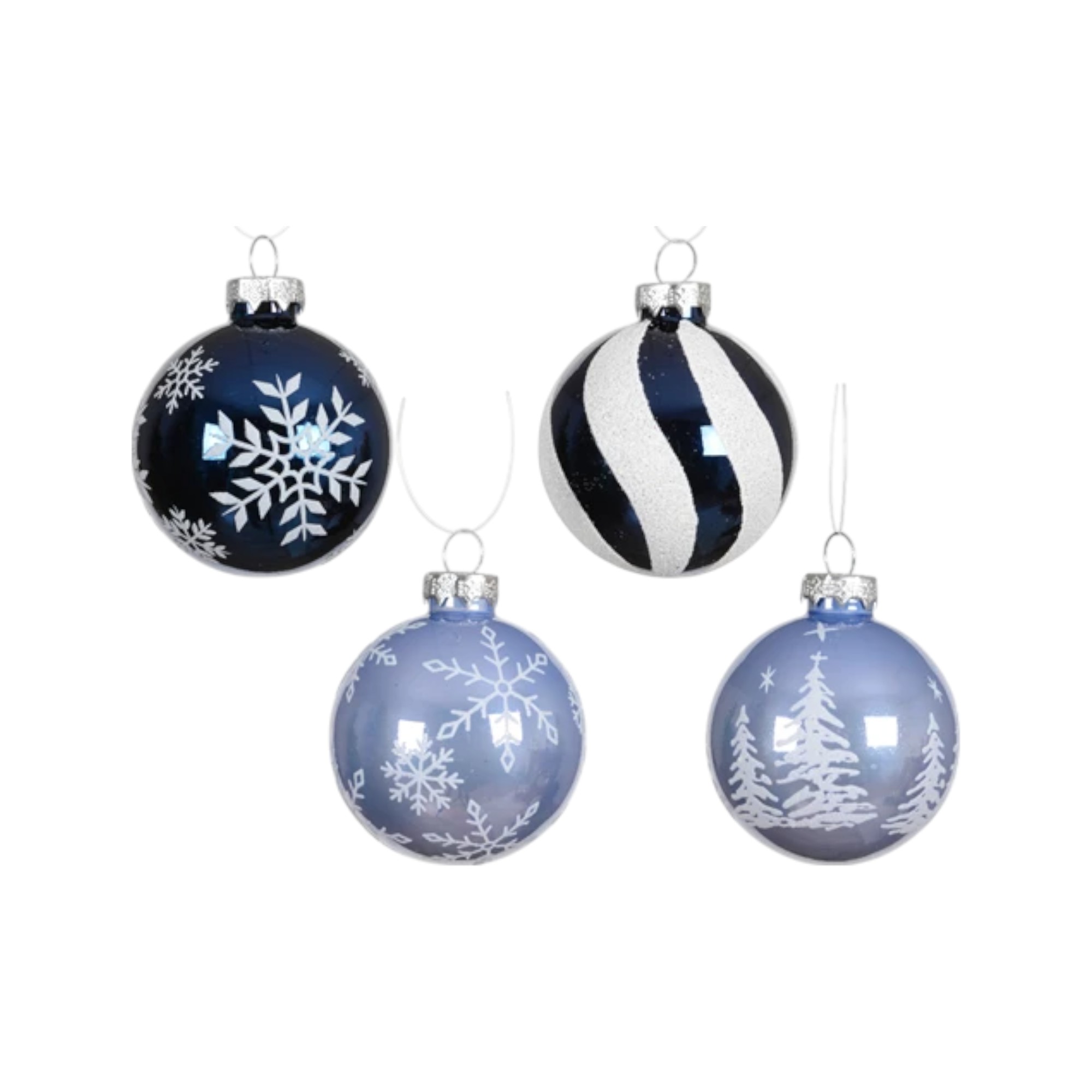 fire styk blå blanke glas julekugler med hvide bolche striber fra øverst til nederst på kuglen