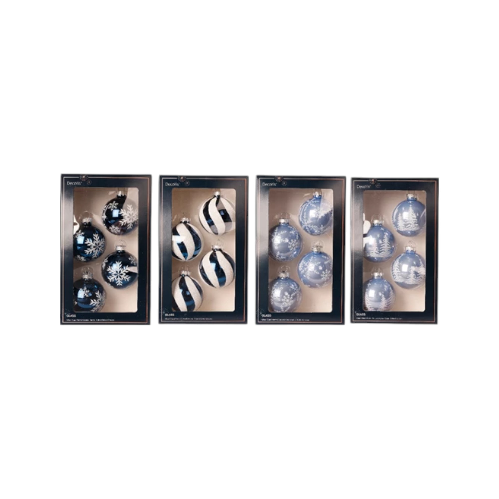 Dekorierte Glas-Weihnachtskugeln. BLAU glänzend mit weißen Glitzerstreifen. 4 stk. identisch in der Packung. Durchmesser von 6 cm. Schmücke deinen Weihnachtsbaum mit diesen Weihnachtskugeln und dein Weihnachtsbaum wird die perfekte Weihnachtsstimmung verbreiten. Wähle ein Farbthema mit demselben Muster oder mixe mit den anderen Farben und Mustern, die wir auch verkaufen. Bewahre die Schachtel zur sicheren Aufbewahrung deiner Glas-Weihnachtskugeln nach Weihnachten auf.