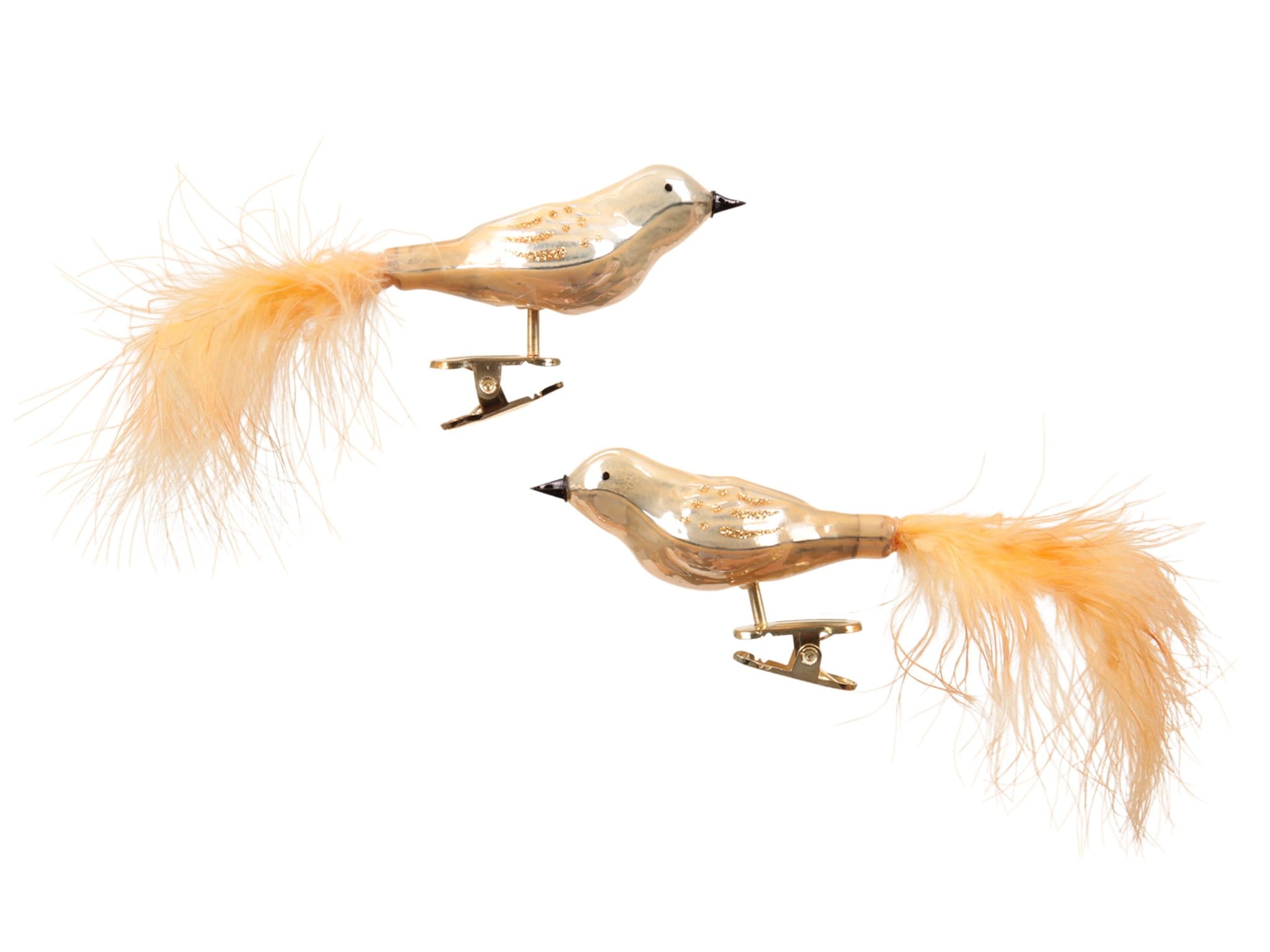 Glasvögel mit Schwanzfedern und Clips in CHAMPAGNER mit etwas Glitzer auf dem Rücken für den Weihnachtsbaum. 2 Stück. Altmodische Glasvögel mit Klemme zum Anbringen an einem Ast deines Weihnachtsbaums. Die Vögel haben farblich passende Federn im Schwanz.