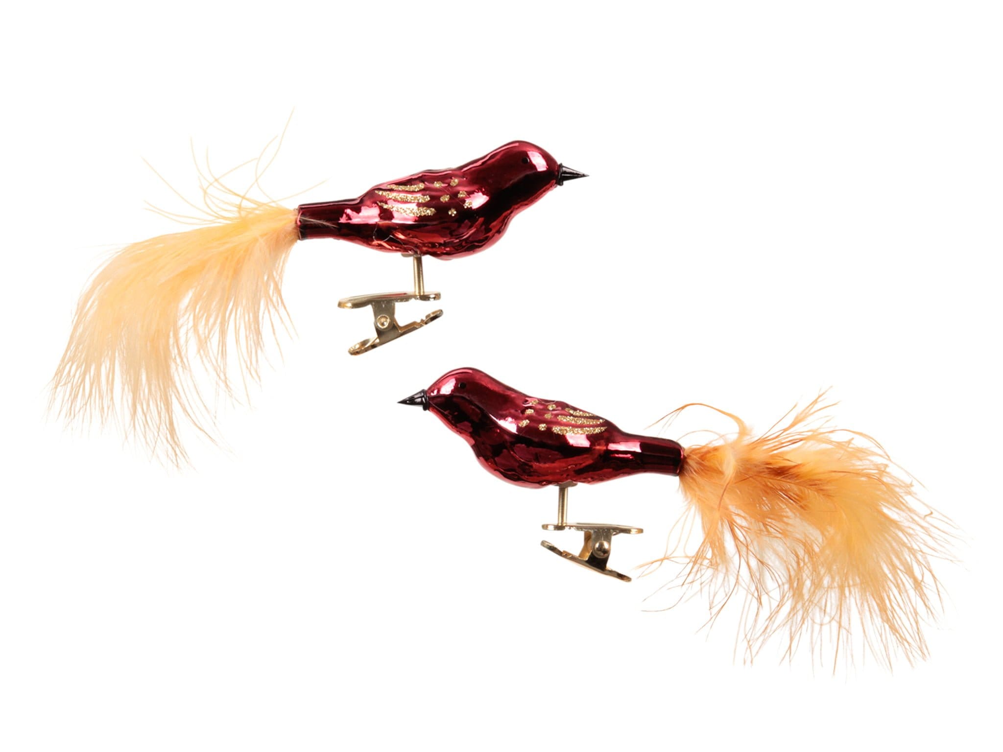 Glasvögel mit Schwanzfedern in DUNKELROT, glänzend. Zwei Stück mit Clips. Für den Weihnachtsbaum