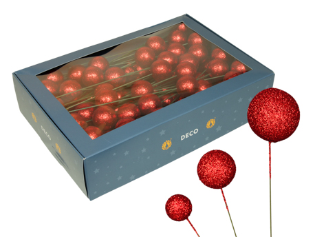 Glitterkugeln auf Draht. Verschiedene Durchmesser von 2, 3 und 4 cm. ROT 100 Stück.