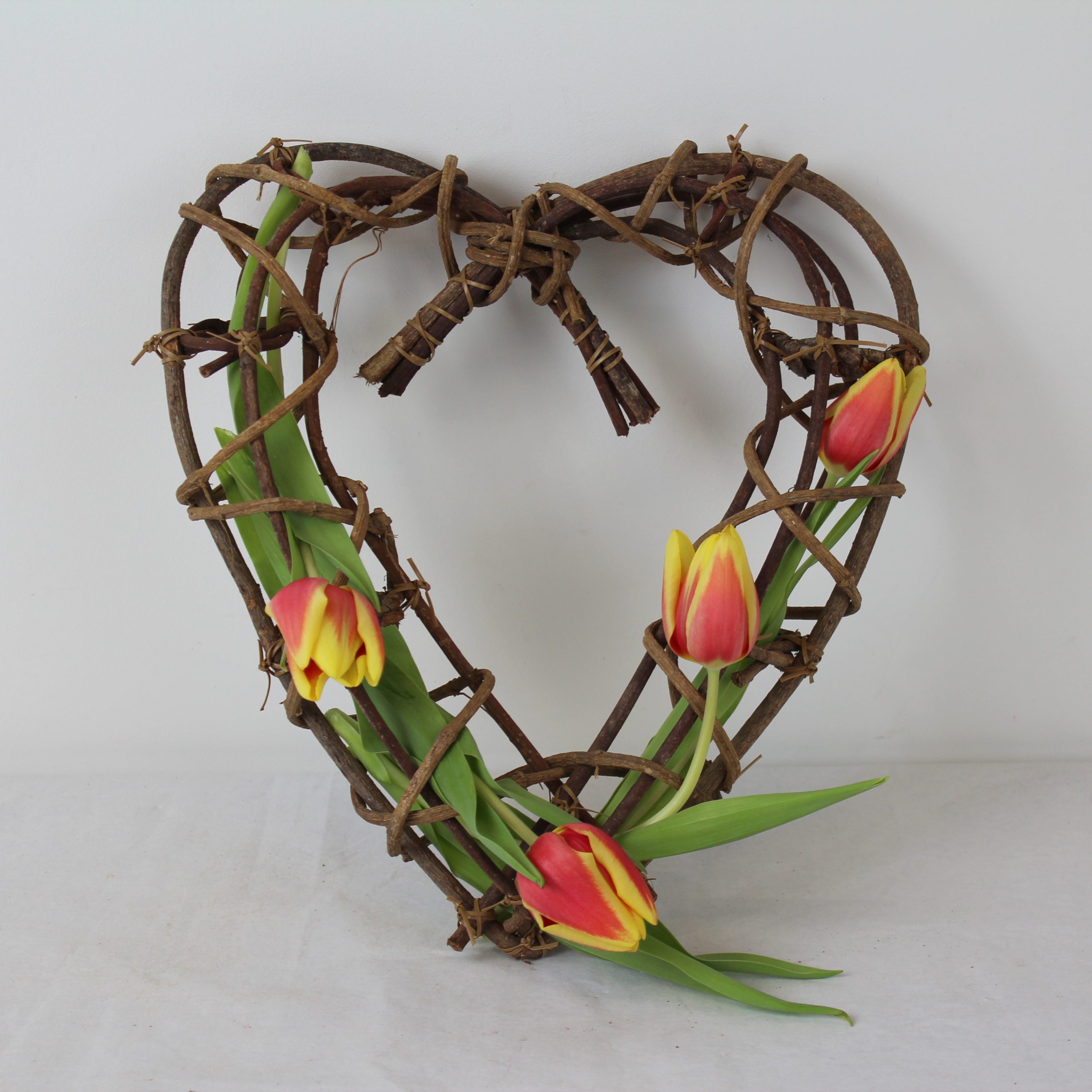 Oben werden die Zweige zusammengebunden, sodass die Herzform entsteht. Die Zweige werden mit naturfarbenen dünnen Plastikbindungen fixiert.