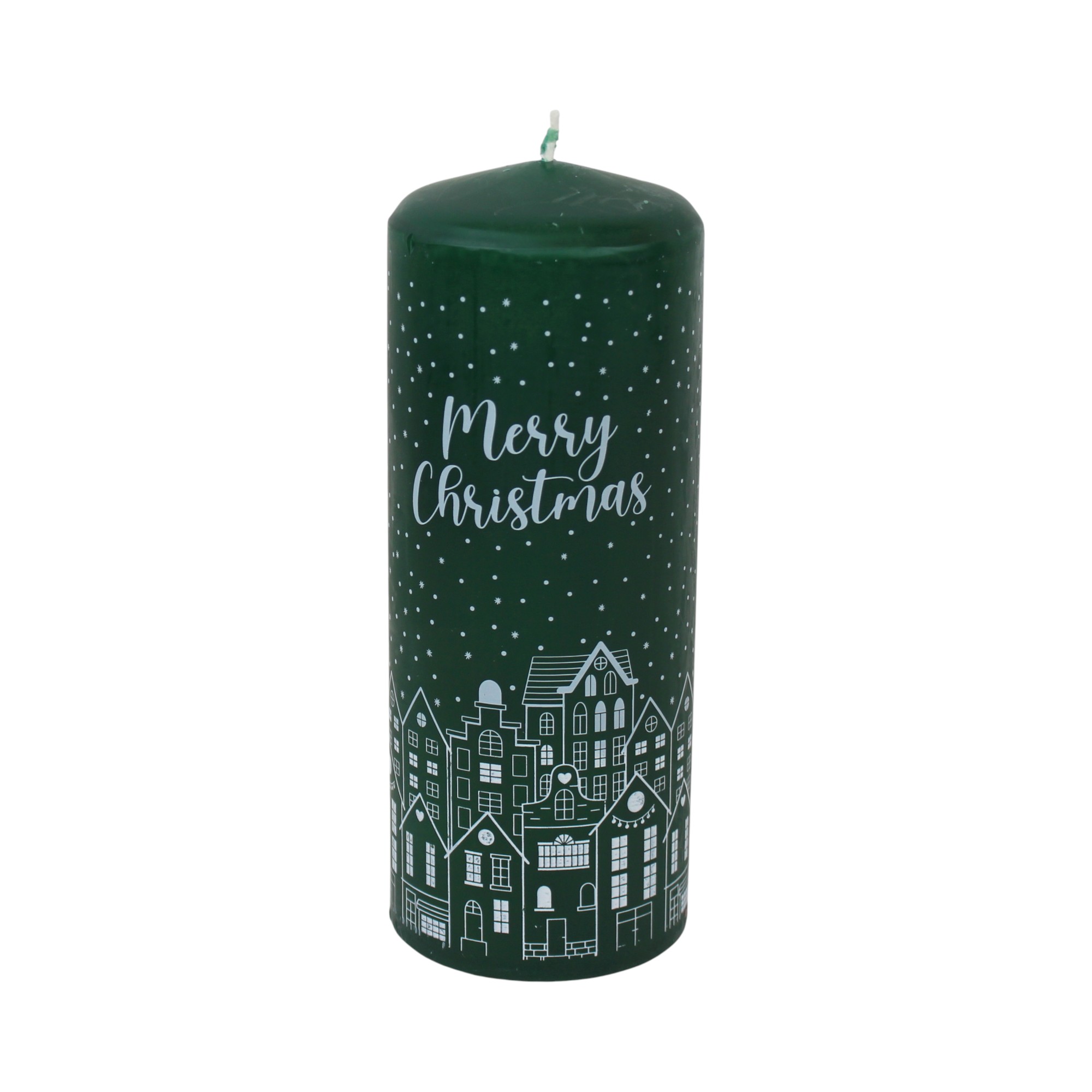 Blokkerze zu Weihnachten GRÜN mit weißen Hochhäusern sowie Merry Christmas und Schnee Durchmesser 7,8 cm. Höhe 20 cm. Gewicht 750 Gramm. Brenndauer ca. 110 Stunden. Material: 100% vollraffiniertes Paraffin.