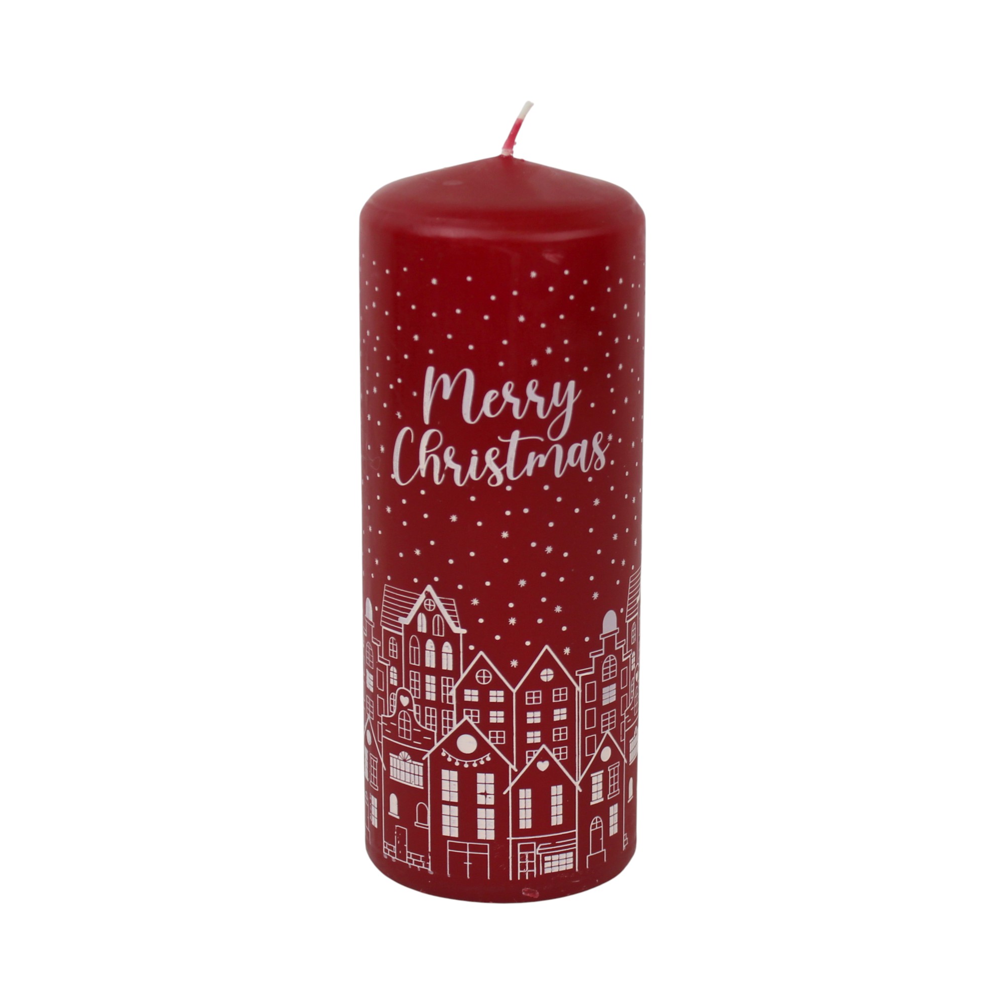 Blokkerze zu Weihnachten in ROT mit weißen Hochhäusern sowie Merry Christmas und Schnee Durchmesser 7,8 cm. Höhe 20 cm. Gewicht 750 Gramm. Brenndauer ca. 110 Stunden. Material: 100% vollraffiniertes Paraffin.