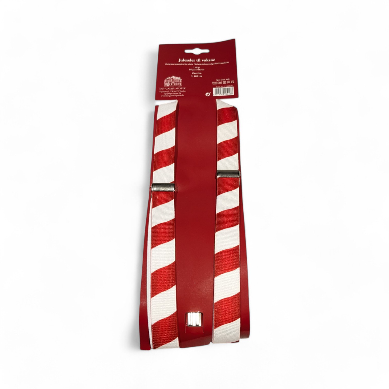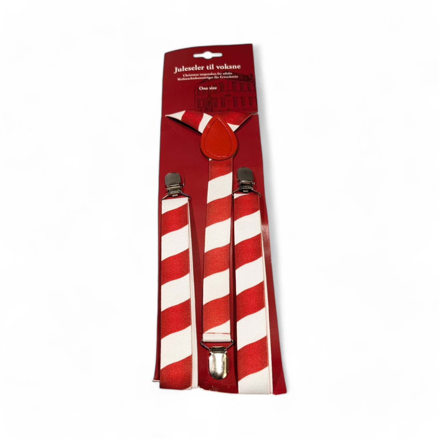 Weihnachts-HOSENTRÄGER für Erwachsene mit roten und weißen schrägen Streifen. One size. Die RIEMEN messen 1 m in der Länge und sind 2,5 cm breit. Sie können mit der Klemme angepasst werden. Befestigt mit METALLSPANNERN und hinten mit imitiertem LEDER zusammengefügt. Material ist POLYESTER und ELASTAN. Werden Sie festlich gekleidet oder kaufen Sie es als Kalendergeschenk.
