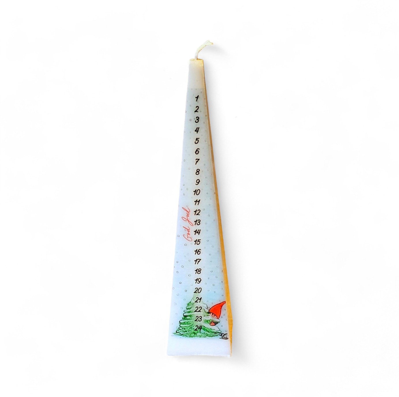 Dieses weiße Adventskalenderlicht ist pyramidenförmig und mit einem Weihnachtsbaum und einem Wichtel verziert. Die pyramidenförmige Form verleiht Ihrer Weihnachtsdekoration eine sehr schöne Eleganz, und wenn es beleuchtet ist, entsteht eine stimmungsvolle und gemütliche Atmosphäre.