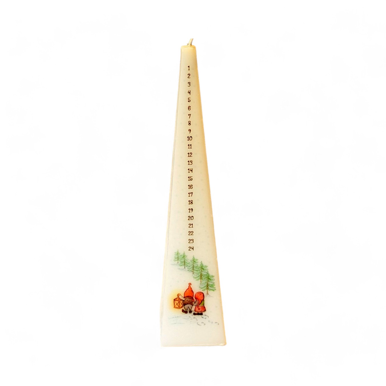 Dieses weiße Adventskalenderlicht ist pyramidenförmig und mit einem Weihnachtsmannpaar verziert. Die pyramidenförmige Form verleiht Ihrer Weihnachtsdekoration eine sehr schöne Eleganz, und wenn es angezündet wird, entsteht eine gemütliche Atmosphäre.