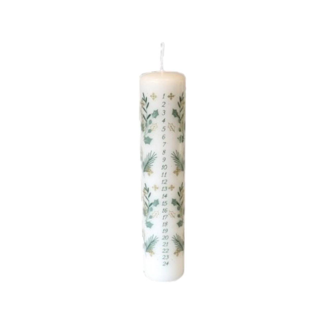 Schöne Kalenderkerze, WEISS mit kleinen Blättern und Tannenzweigen und grünen Zahlen.