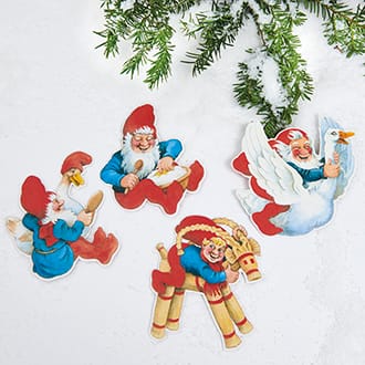 Karton-Wichtel von Vilhelm Hansen – 15 cm. 4 Stück pro Beutel. Die vier verschiedenen fröhlichen Wichtelfiguren sind mit Gänsen, Milchreis und Weihnachtsbock. Zum Aufhängen und als Weihnachtsschmuck wie Kletterwichtel. Beidseitig bedruckt. Gute Idee für Kalendergeschenke und Päckchenspiele. Auch in einer größeren Ausgabe erhältlich.