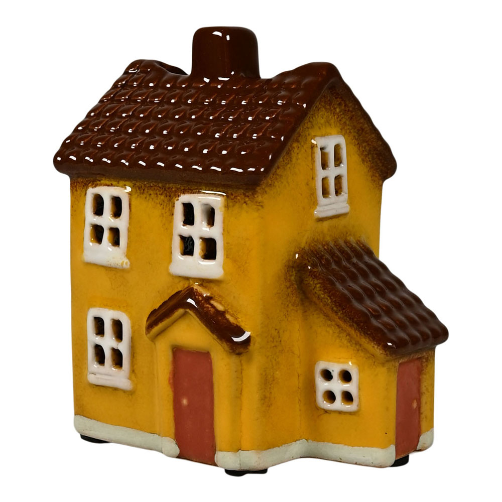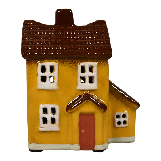 Keramikhaus für Teelichter. Gelbes niedriges Haus 10 x 8 x 6 cm.