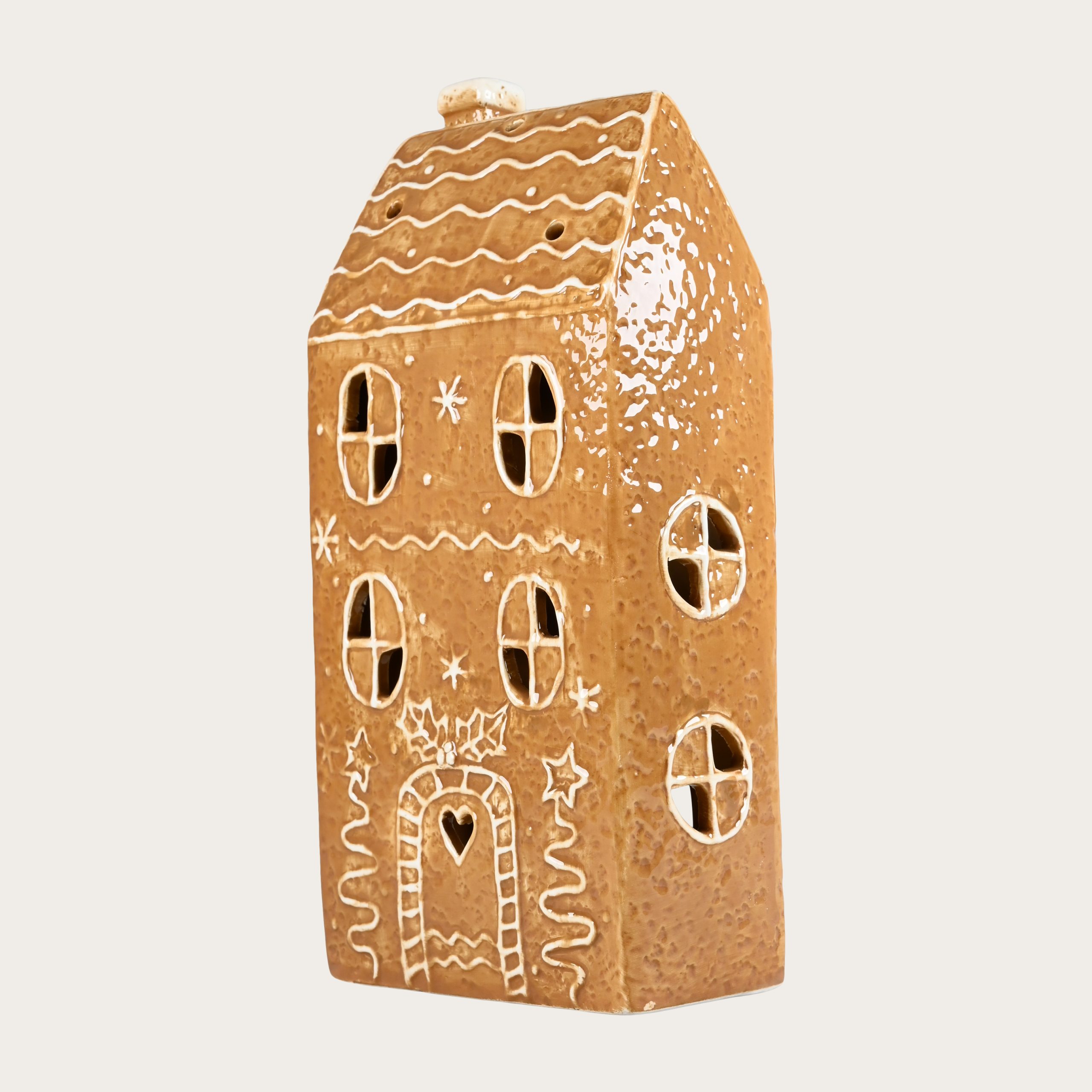 Keramikhaus für Teelichter, hoch, hellbraunes Lebkuchenhaus, Höhe 24,2 cm.