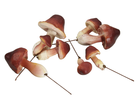Kleine Pilze auf Draht. Verschiedene Formen und Größen in braunen Farben. 24 Stück.