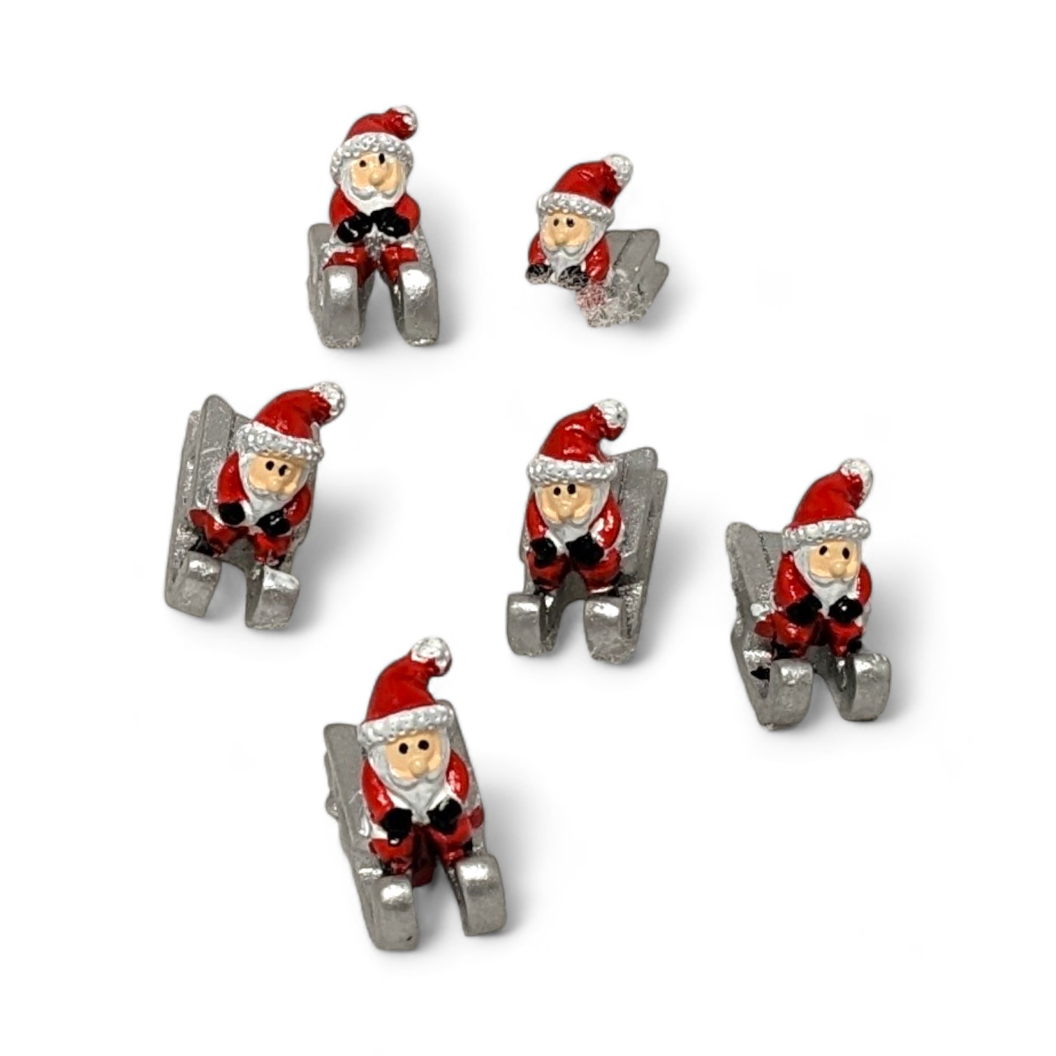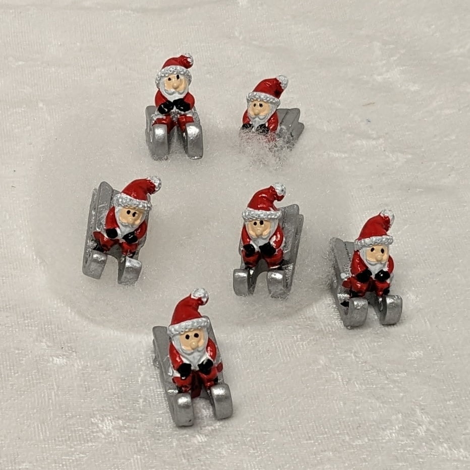 Kleine Weihnachtsfiguren mit Weihnachtsmann auf Schlitten. 6 Stück. 3 x 3,4 cm.