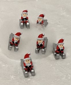 Kleine Weihnachtsfiguren vom Weihnachtsmann auf einem Schlitten. 6 Stück. 3 x 3,4 cm. Süße kleine Miniatur-Weihnachtsmänner, die auf einem silberfarbenen Schlitten sitzen. Du bekommst 6 Stück in der Box. Verwende sie in Weihnachtslandschaften. Die kleinen Figuren sind spielbeständig und aus Polystone gefertigt.