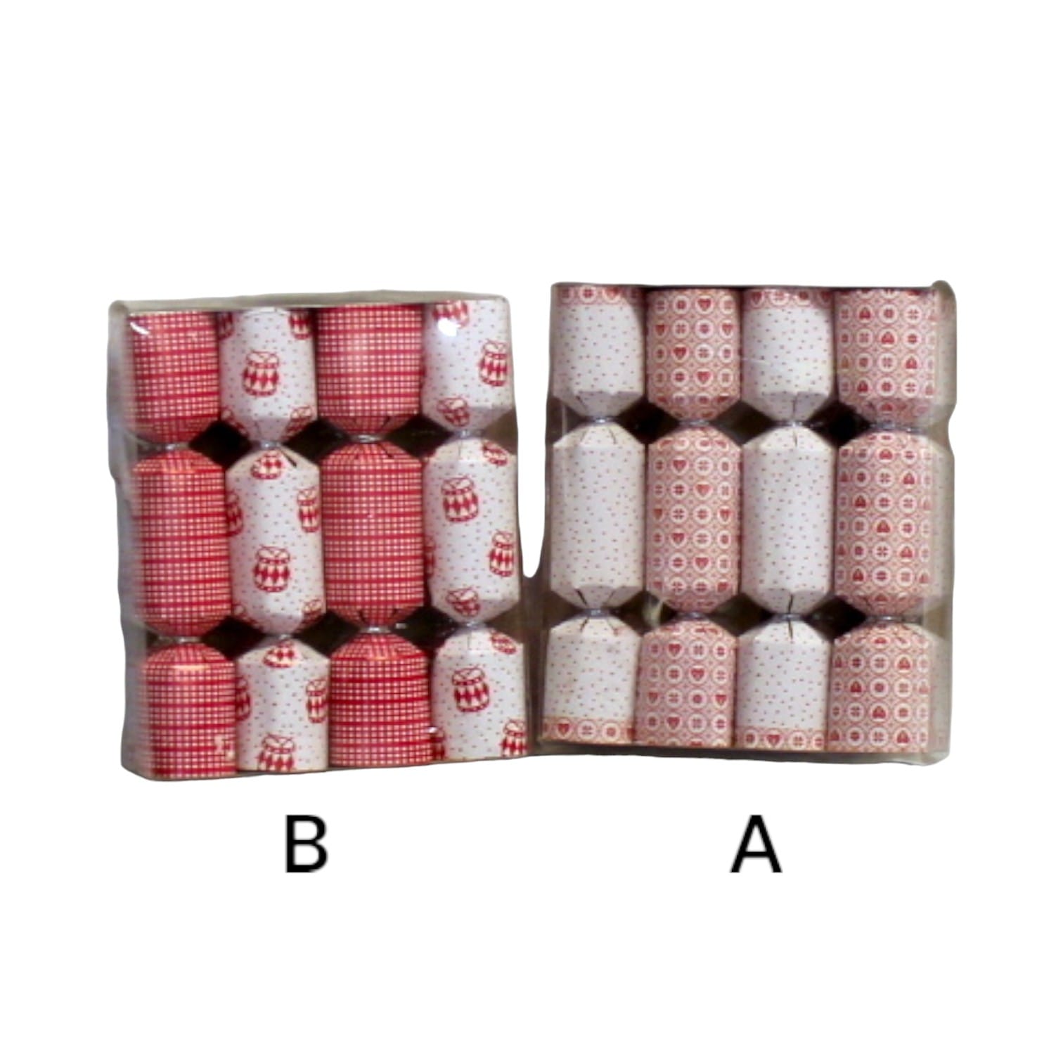 Knallerbsen, weiß mit rotem Druck. 14 cm. 8 Stück. Zwei verschiedene Drucke. Festliche Dekoration