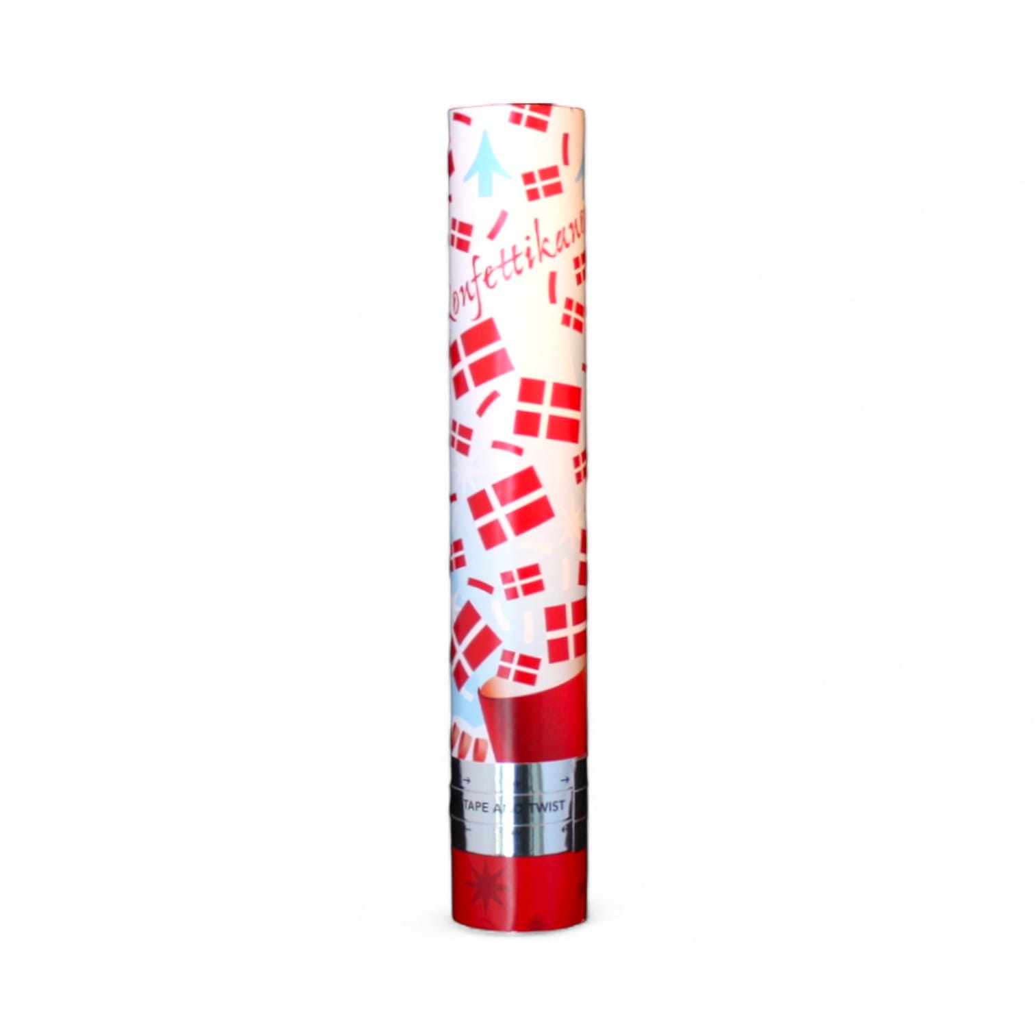 Konfettikanone mit rotem und weißem Seidenpapier und Flaggen. Die Kanone misst 30 cm und das Rohr ist 5 cm.