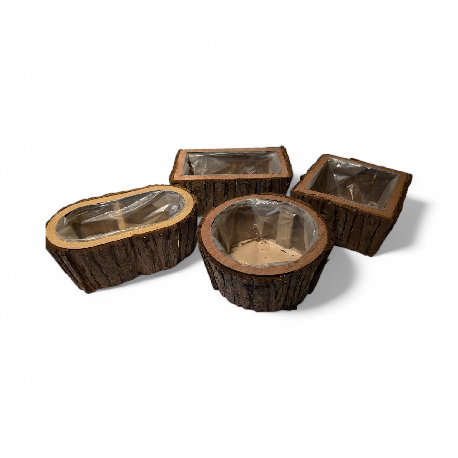 Korb, quadratischer Übertopf in Natur-Rinde 18 x 18 cm mit Plastik innen. Die Innenmaße des Korbes sind 13,5 cm. Materialien: Holz und Plastik. Der Korb kann für nasse Dekorationen mit Oasis oder für Topfpflanzen verwendet werden.