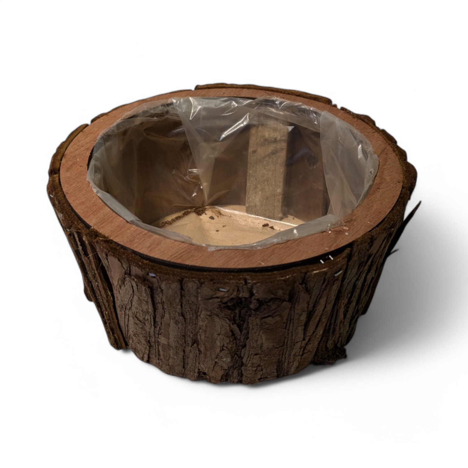 Korb, runder Übertopf in Natur-Rinde. Durchmesser 21 cm. mit Plastik innen. Die inneren Maße des Korbes sind 16 cm. Materialien: Holz und Plastik. Der Korb kann für nasse Dekorationen mit Oasis oder für Topfpflanzen verwendet werden.