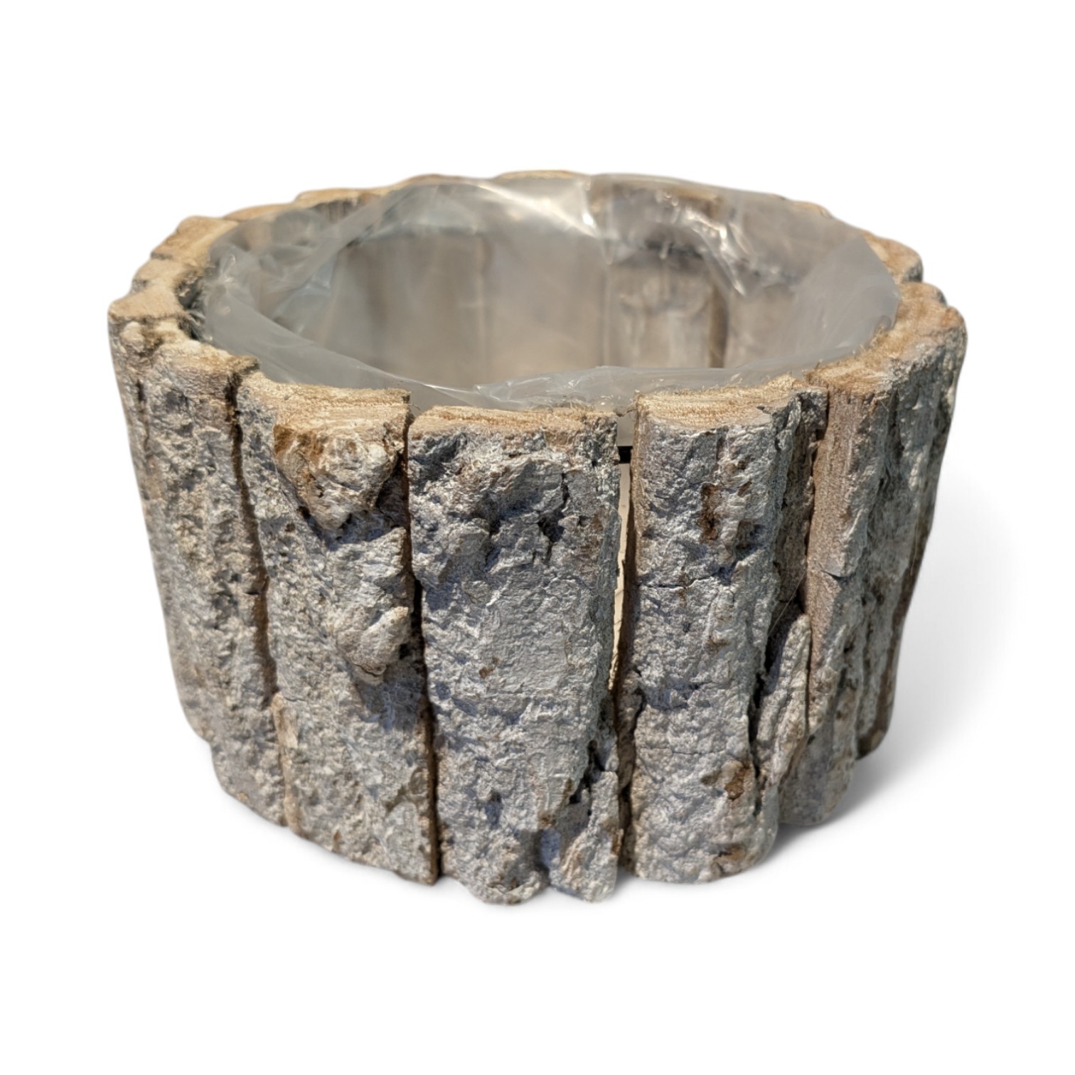 Korb, runder Übertopf in weißer Natur-Rinde. Durchmesser 15 cm. mit Plastik innen. Die inneren Maße des Korbes sind 12 cm. Materialien: Holz und Plastik. Der Korb kann für nasse Dekorationen mit Oasis oder für Topfpflanzen verwendet werden.