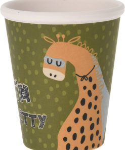 Becher in grünem Melamin mit Tiermotiv mit einer Giraffe.